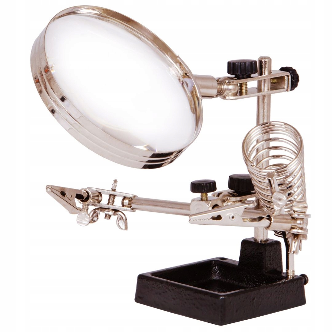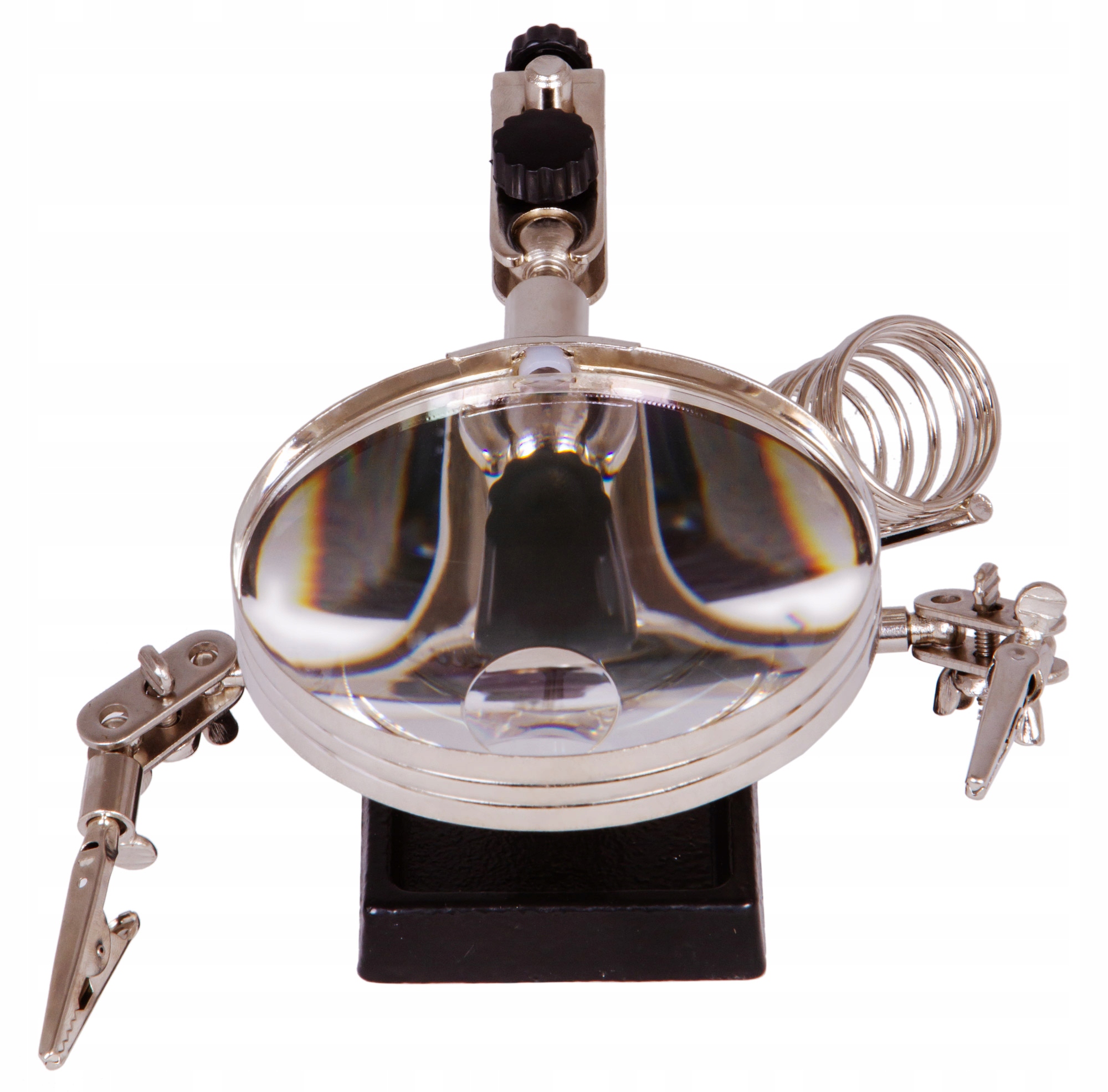 настільна лупа, яка поєднує в собі функціональність і комфорт. Оснащений біфокальною лінзою, він пропонує 2x і 6x збільшення, що робить його ідеальним для точної роботи. Металева конструкція гарантує стійкість і довговічність, а додаткові затискачі і тримач паяльника забезпечують надійне кріплення предметів, що значно полегшує роботу. Лося для аксесуарів дозволяє мати всі необхідні інструменти під рукою.