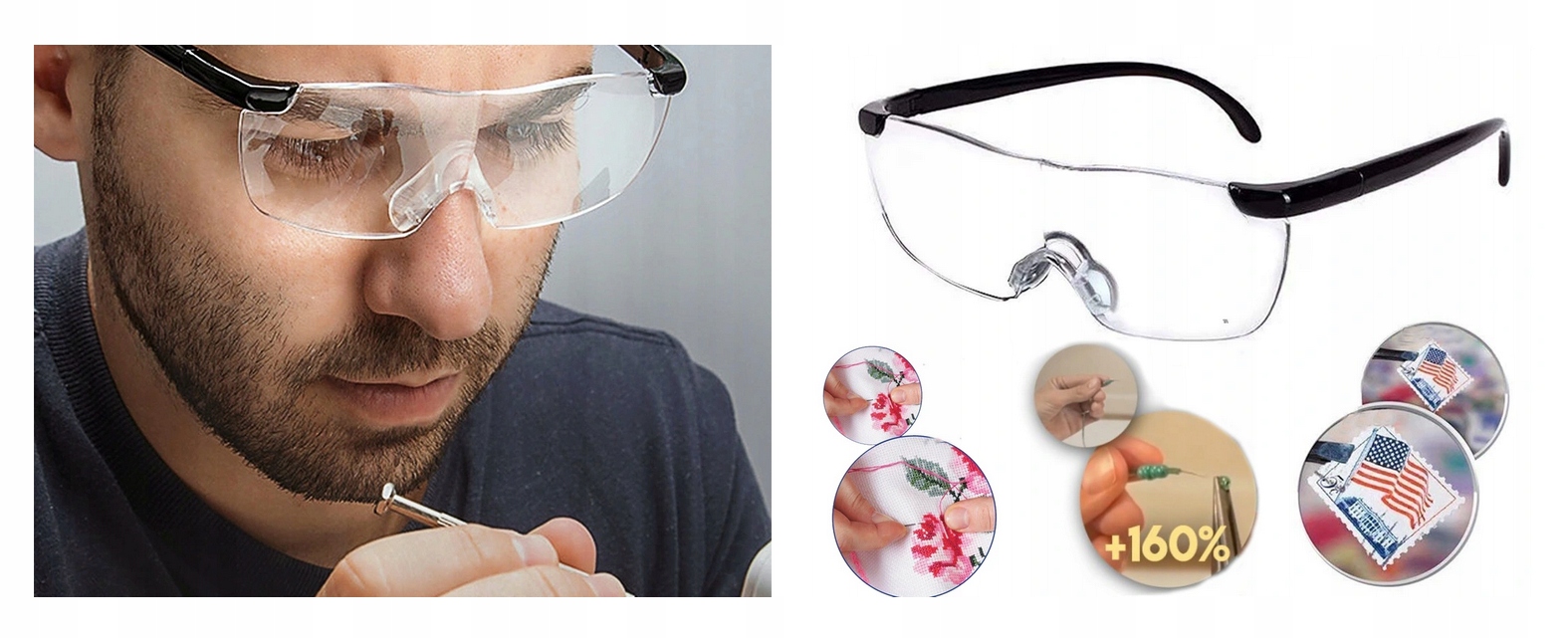 Збільшувальні окуляри є ідеальним рішенням для людей, які мають проблеми з чітким баченням дрібних предметів. Завдяки збільшувальному склу на 160% ви без проблем зможете заправити нитку в голку, прочитати дрібний шрифт у газеті чи замінити батарейки в годиннику. Тому вони ідеально підходять для виконання точних домашніх завдань.