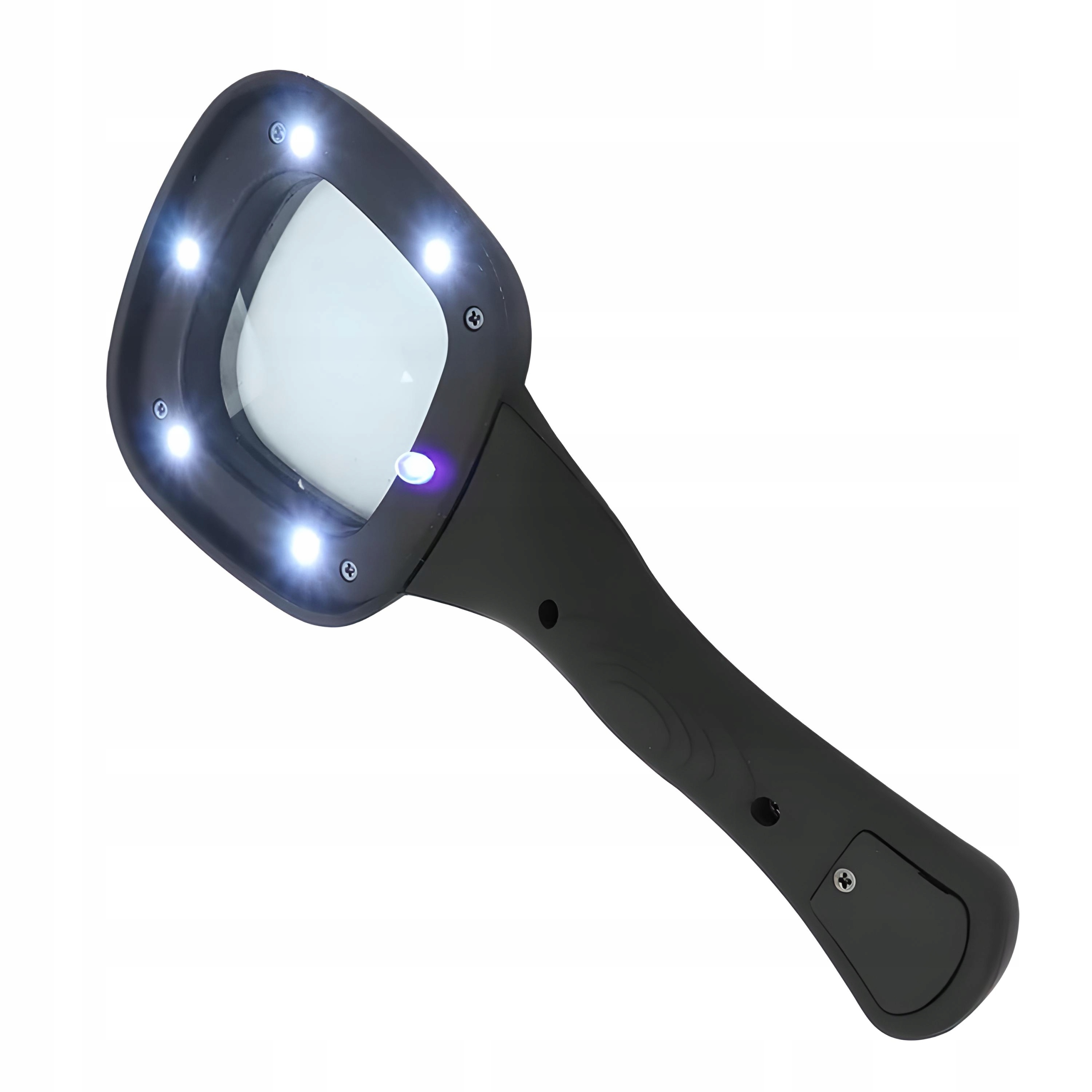 Збільшувальне скло має фіолетове світло для перевірки банкнот. Лупа для банкнот із підсвічуванням — це спеціальний інструмент, який часто використовують для перевірки справжності банкнот або для вивчення дрібних деталей на них. Лупа має вбудоване фіолетове підсвічування, яке підсвічує банкноту, що розглядається, дозволяючи більше точні спостереження .