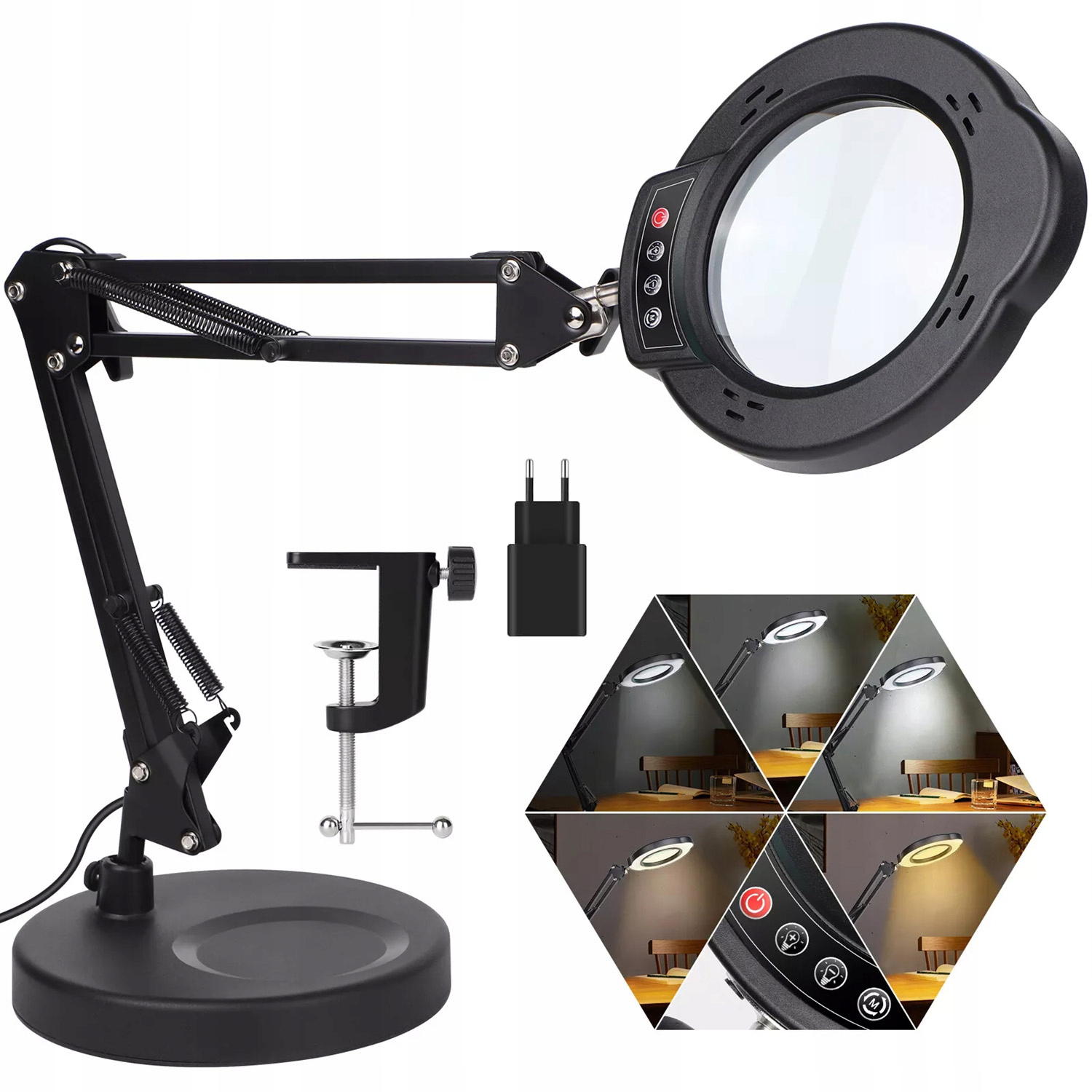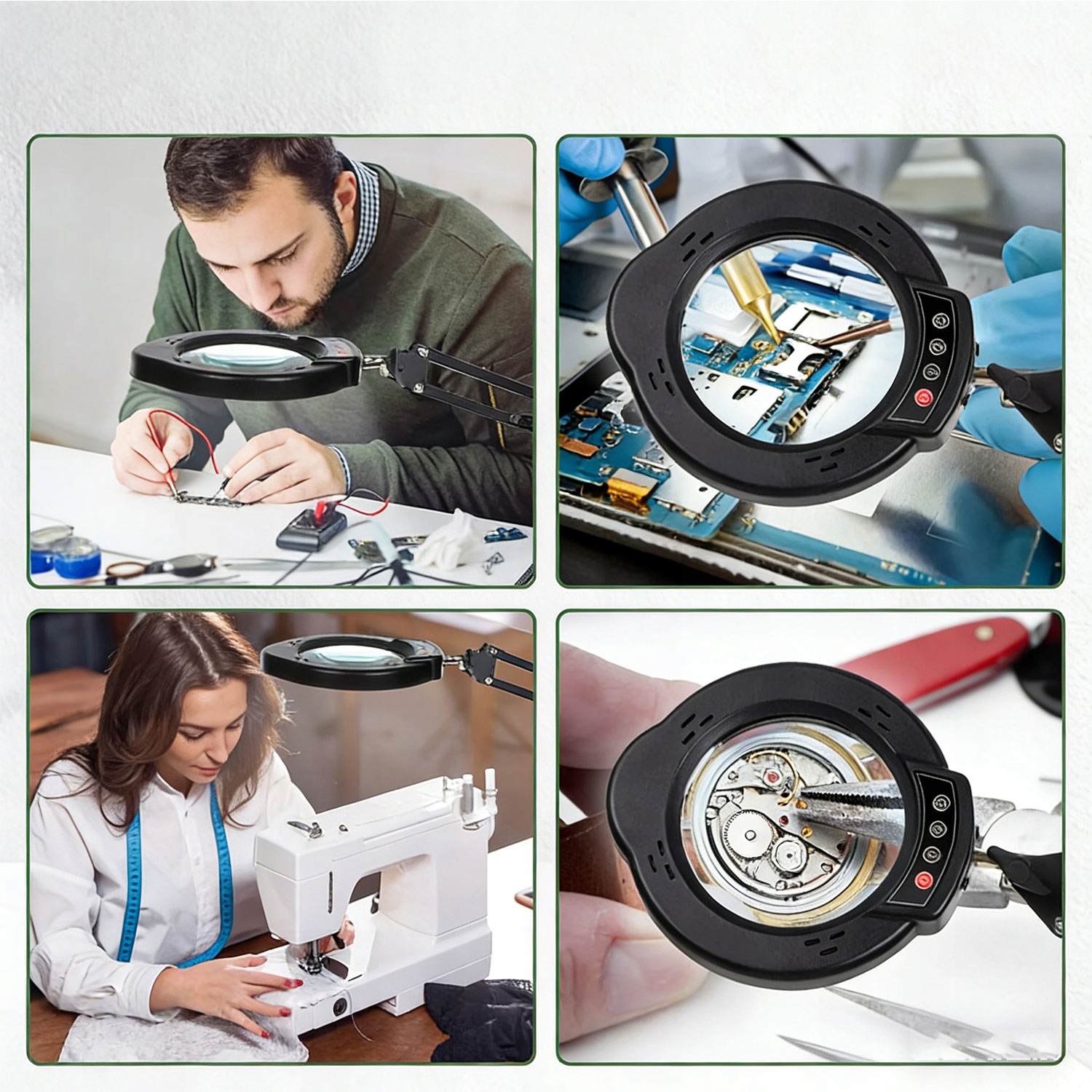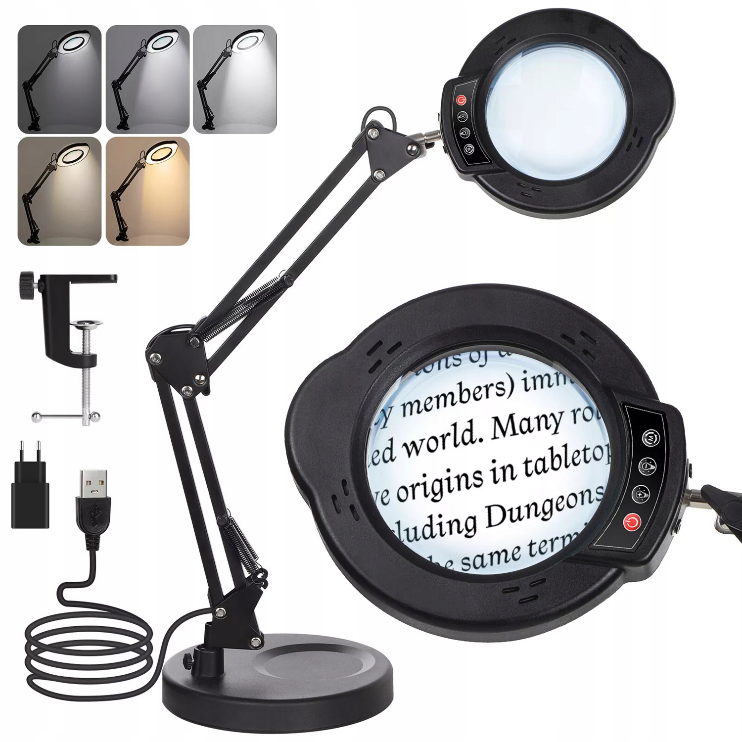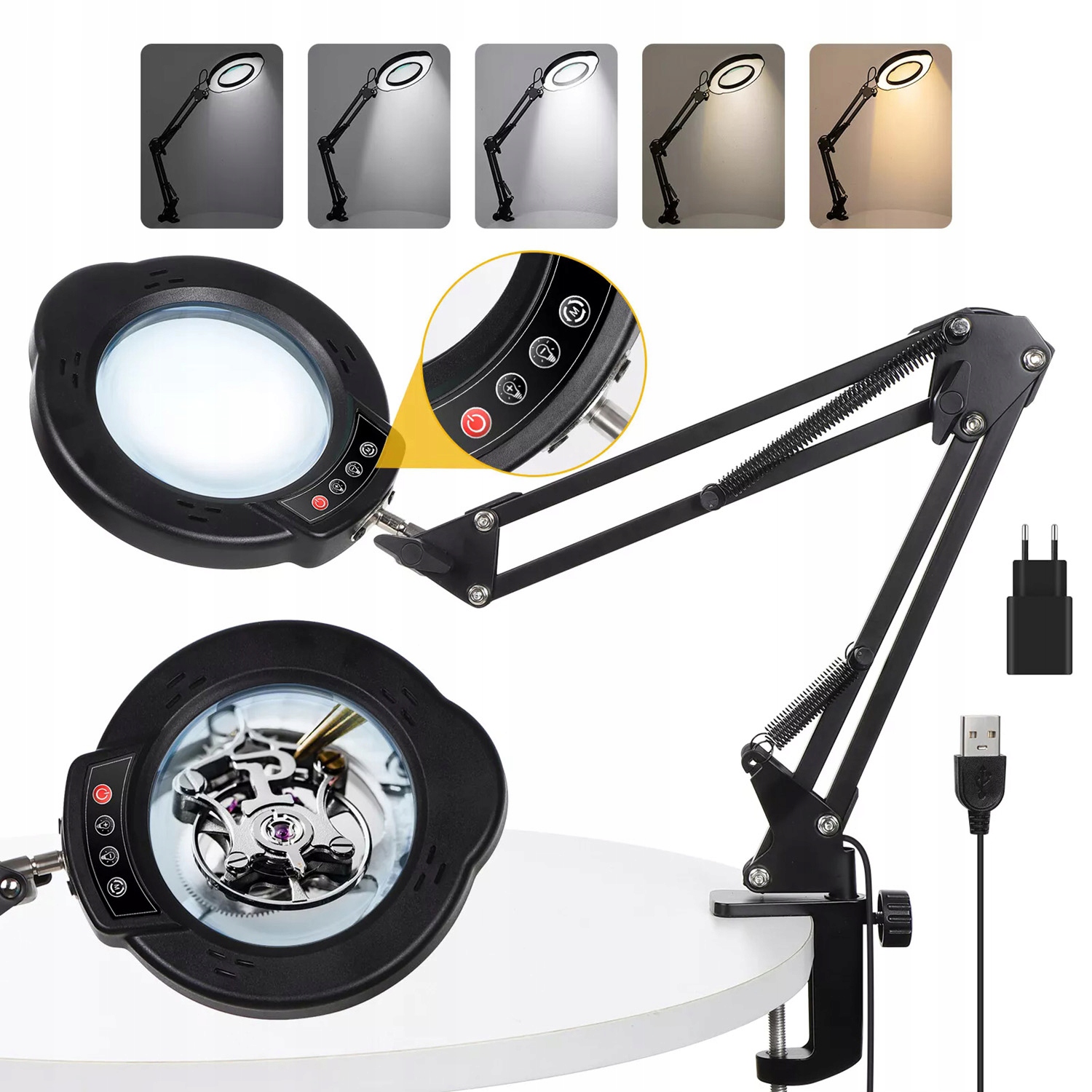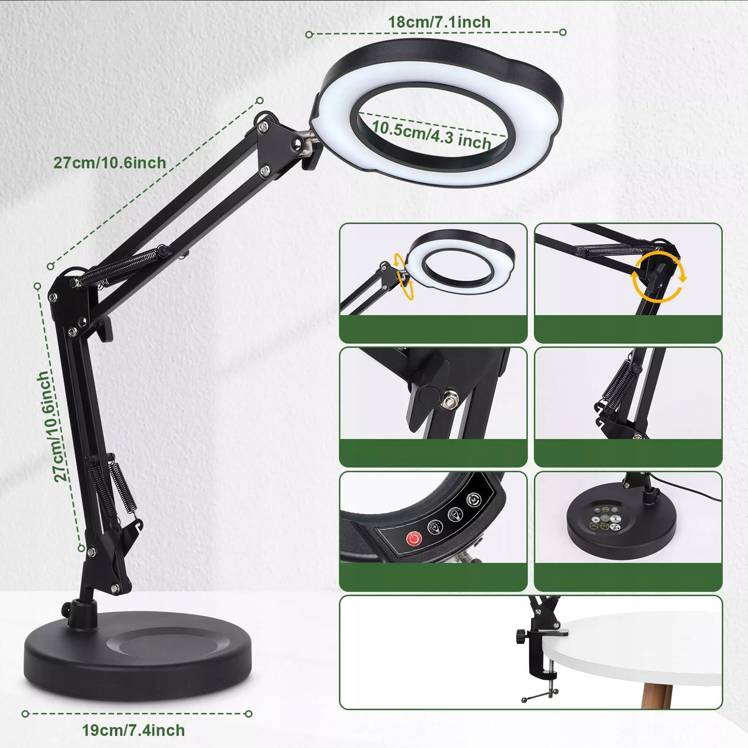🌈 Гнучка поворотна рука: Лупа дозволяє працювати без використання рук. Ручка висувається і обертається, а ручка дозволяє надійно зафіксувати лупу в обраному положенні, залишаючи обидві руки вільними. Голова обертається на 360°, що дозволяє встановити її під будь-яким кутом відповідно до ваших потреб.