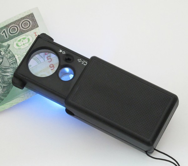 З довгохвильовою ультрафіолетовою лампою для огляду, наприклад, марок і банкнот.