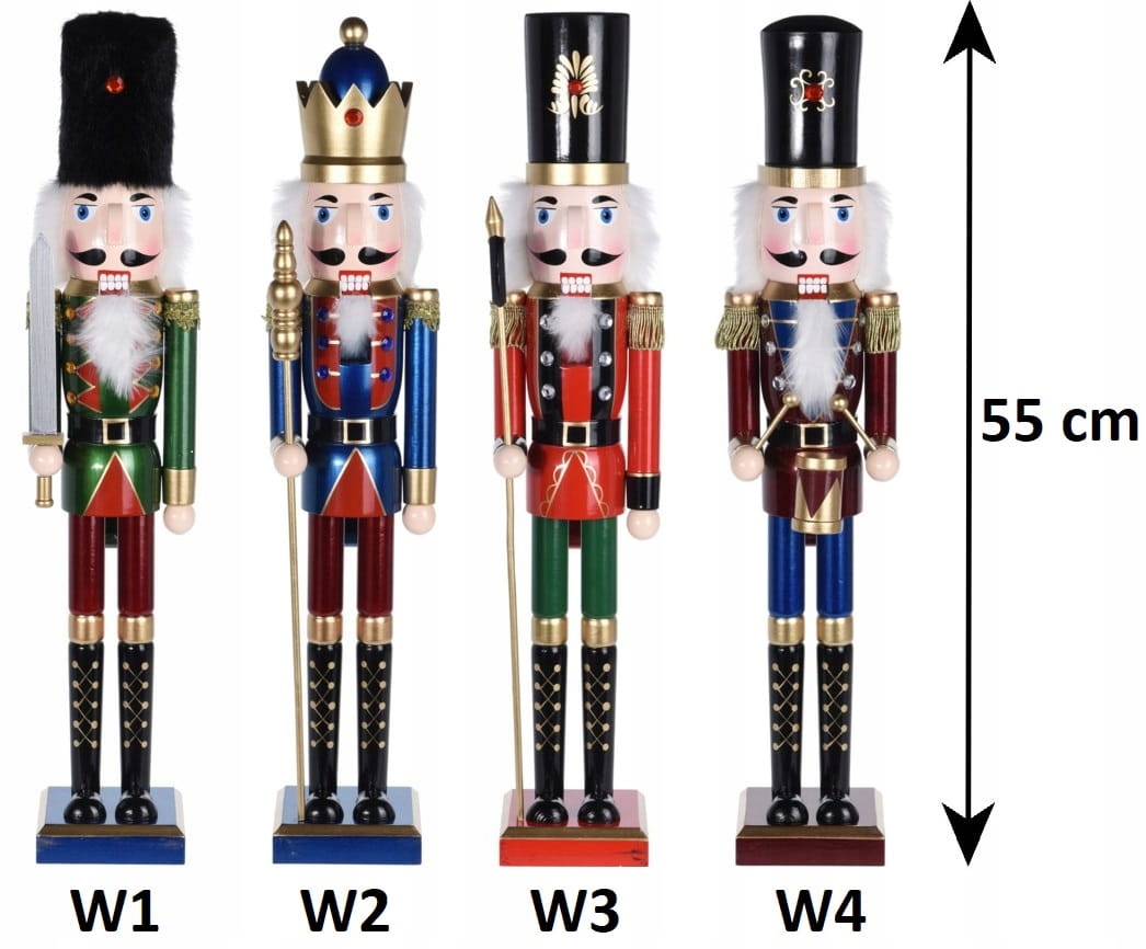 Стояча фігурка Лускунчика 55 см. З дерева, пофарбований. Волосся та борода білого плюшевого ведмедика. Ззаду є важіль для переміщення нижньої щелепи. У цій серії є 4 дизайни.