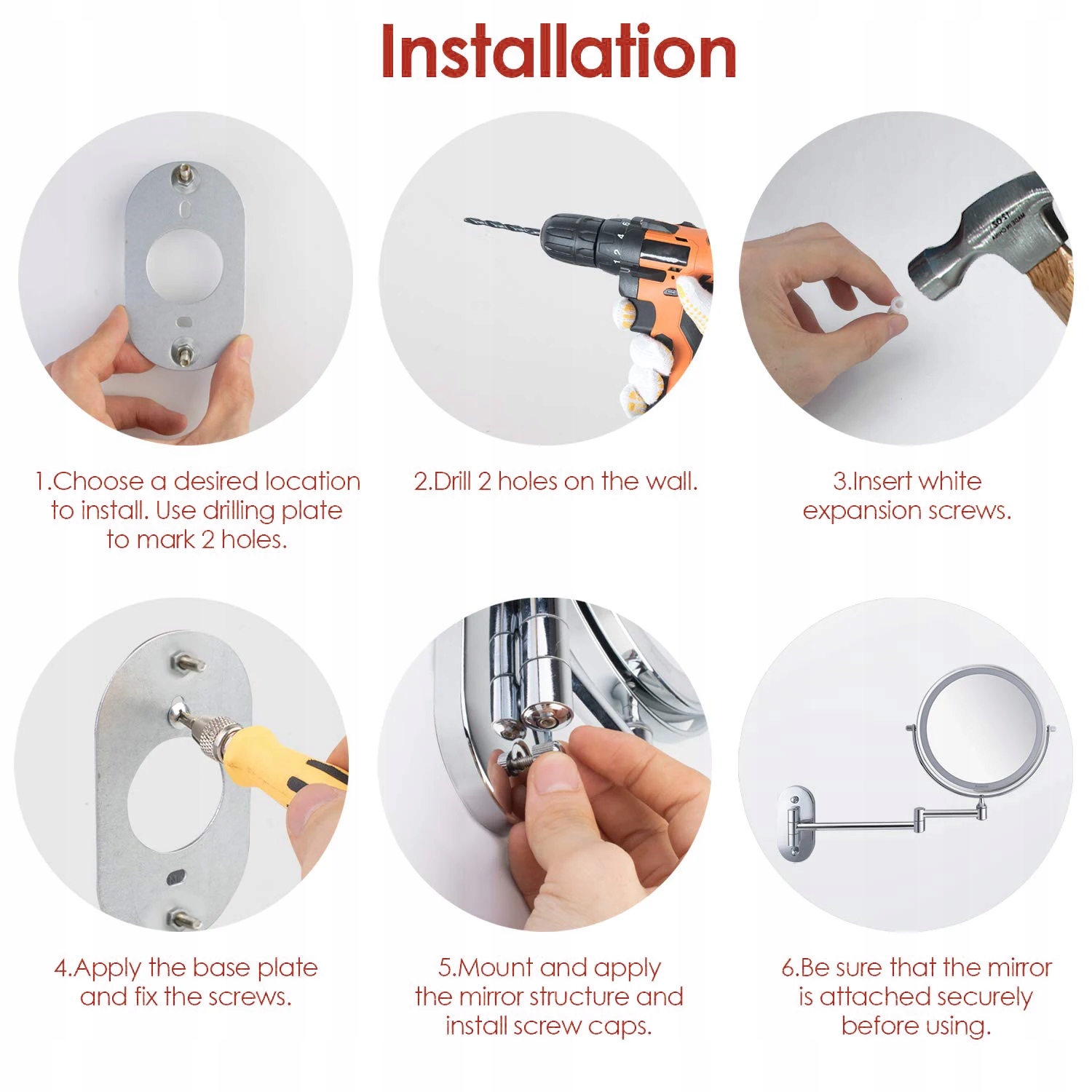 Ви можете просто просвердлити 2 отвори за допомогою шаблону, що додається, а потім швидко прикріпити дзеркало для гоління до стіни; або ви можете слідувати покроковим інструкціям зі встановлення.