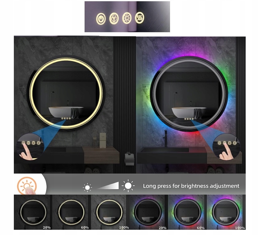 - Кругле світлодіодне дзеркало RGB - переднє освітлення з 3 кольорами затемнення: білий/денне світло/теплий білий забезпечує достатньо світла для макіяжу та гоління. Підсвічування забезпечує 8 кольорів світла RGB: холодний/білий/червоний/світло-зелений/темно-зелений/блакитний/темно-синій/фіолетовий/багатоколірний.
