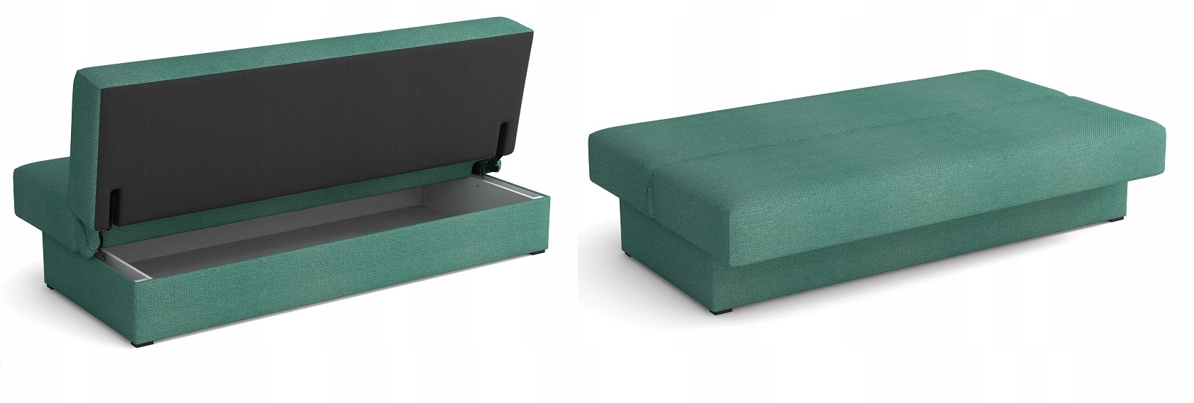 Зображення, на яких показано розкладання дивана-ліжка та контейнера для постільної білизни