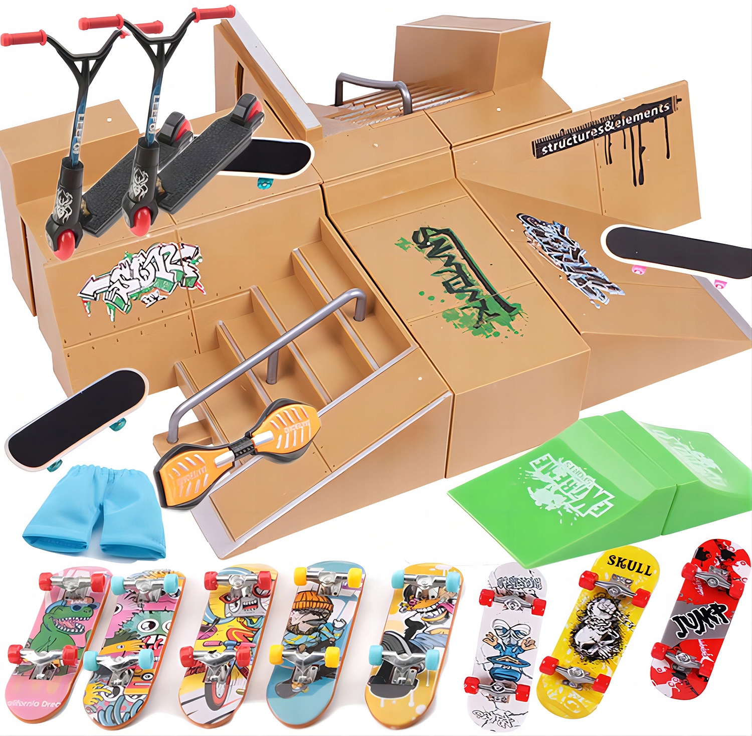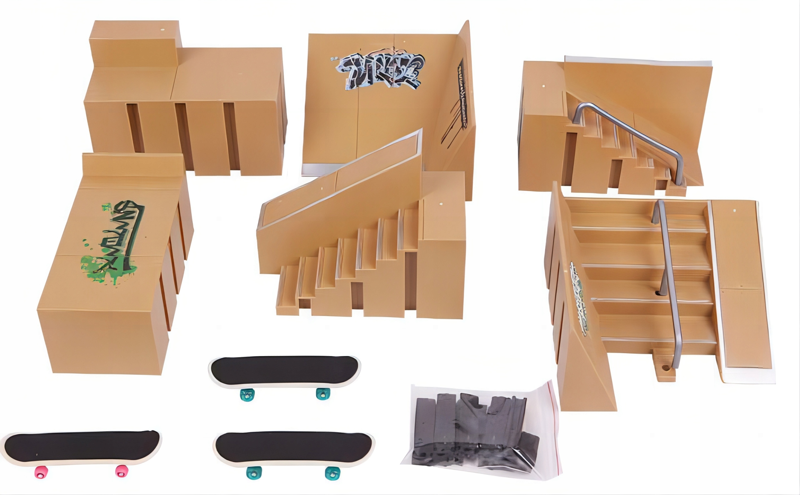 Легко в установці: набір включає посібник для пальців для міні -скейтборду. Доступно багато моделей складання. Побудова власного скейтбордського парку так просто. Він також може поєднуватися з набором для скейтпарку інших брендів, щоб отримати величезний скейтпарк для гри на пальцях