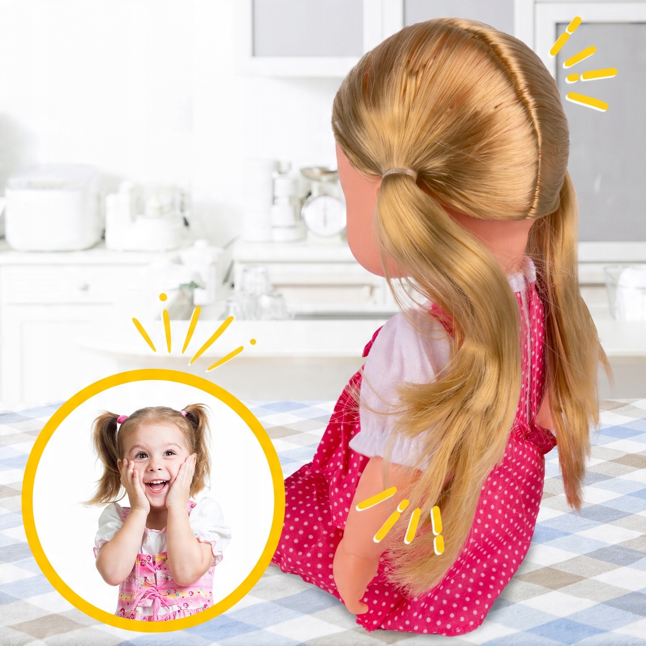 Дитина може доглядати за волоссям ляльки, робити різні зачіски та мити її!