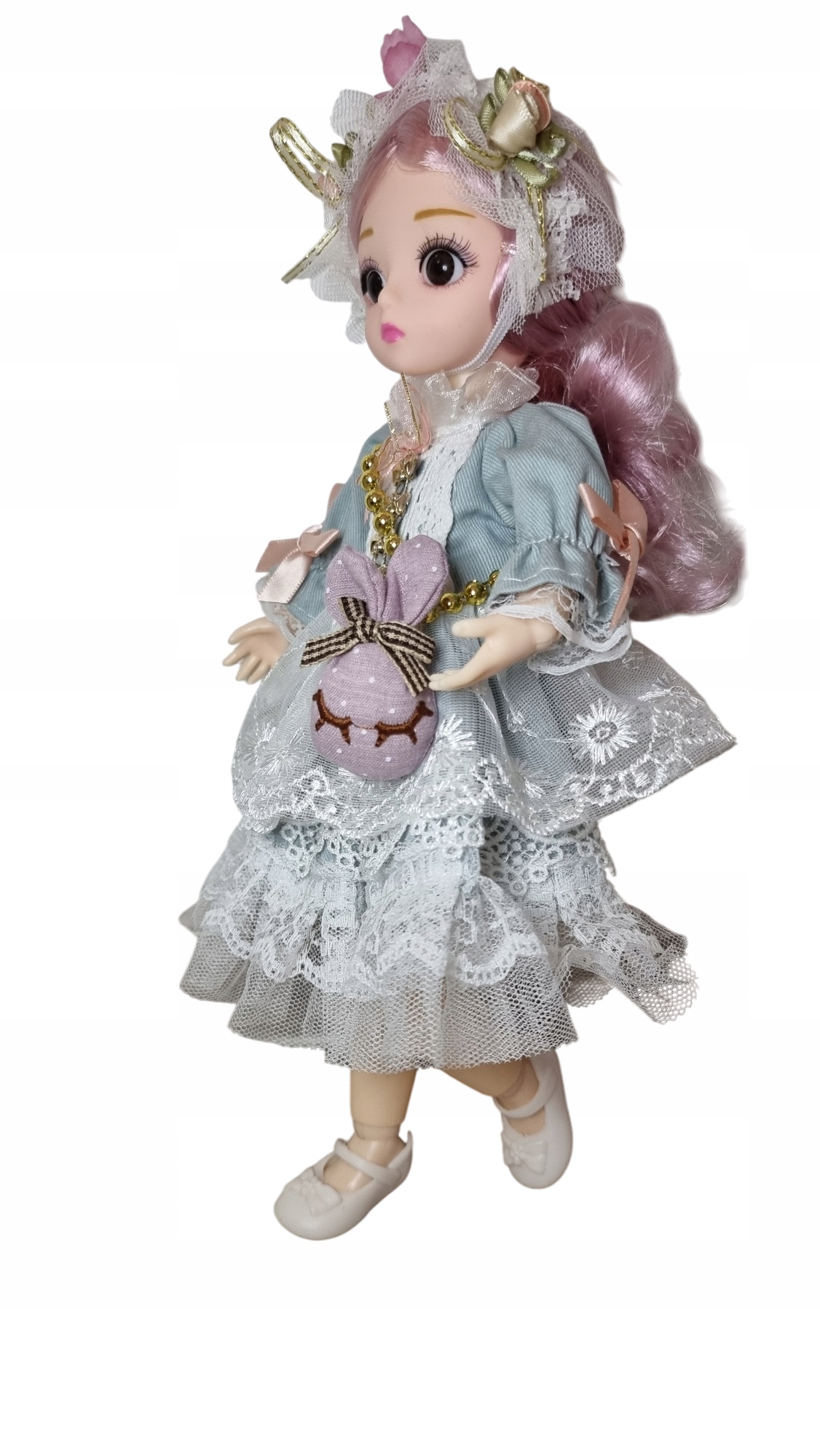 Лялька одягнена в елегантне плаття в романтичному стилі, що зберігається в пастельному синьому кольорі, прикрашеному багатими деталями білого мережива. Сукня має багато -ланцюгове дно з ніжними мереживними візерунками, що нагадує квіти, що додає легкість та стиль.