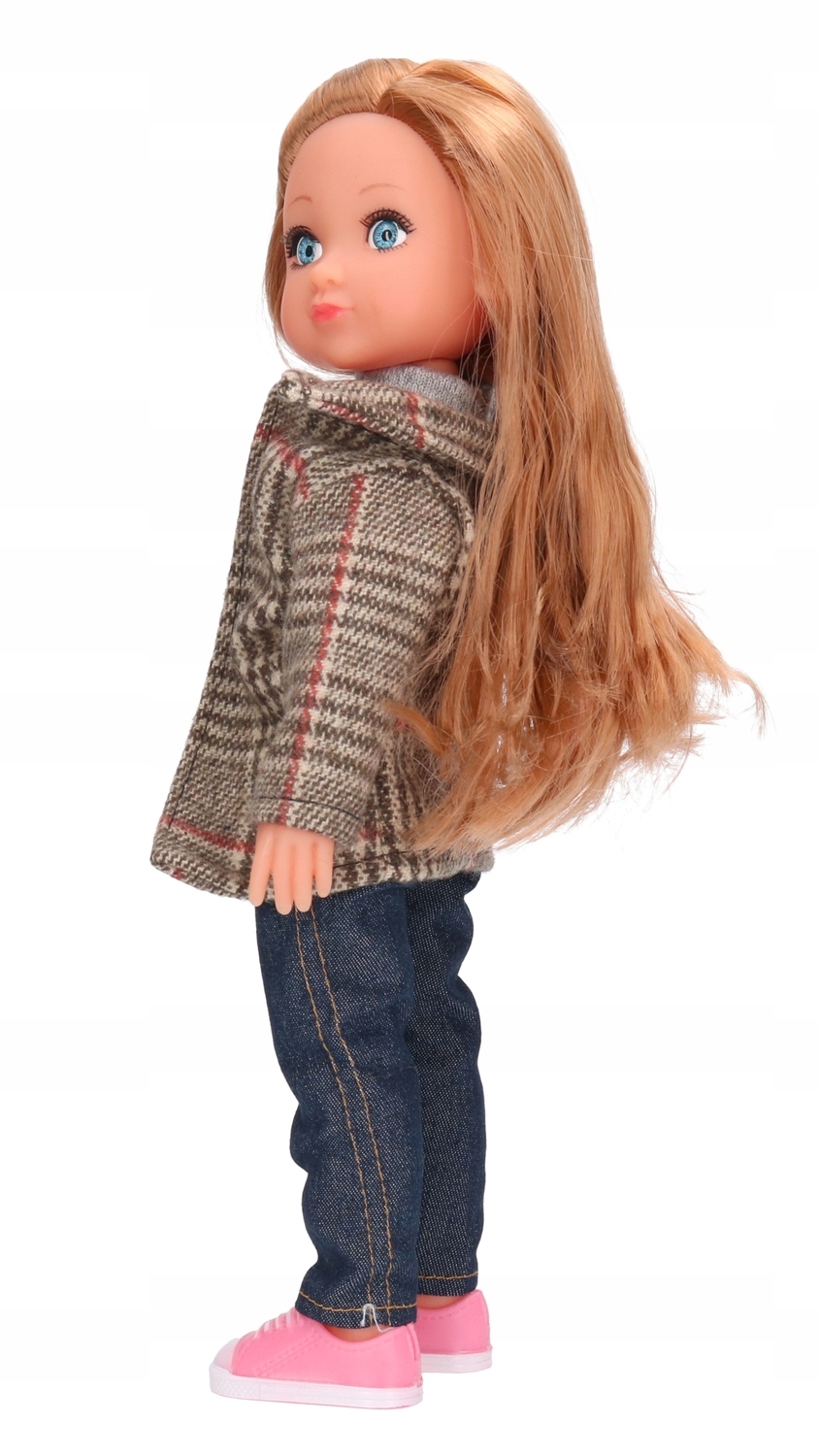 Лялька одягнена у стильний одяг: джинси, светр і пальто. Шкарпетки та кросівки завершують образ.