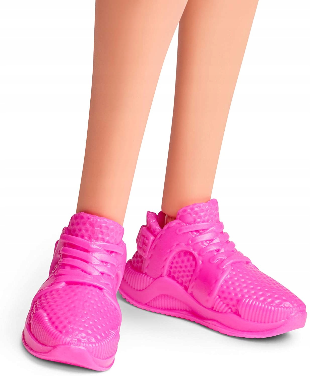 Ось одна з незвичайних версій колекційної серії Barbie BMR1959. Унікальна лялька з красивим довгим темно-світлим волоссям і маленькими косичками з пучком на маківці однозначно привертає увагу. Ця дівчина вміє поєднувати аксесуари, щоб кожна укладка була чарівною. На Барбі жовтий світшот із сітчастими рукавами та друкованим логотипом. Велосипедки чорні з додатковим шаховим візерунком. Унікальний наряд доповнюють рожеві кросівки, срібні каблучки та сережки, а також блакитний гаманець на талії. Секрет модного стилю цієї Барбі - це відтворення стилю вуличного одягу. Сильний макіяж ідеально поєднується з усією укладкою. Лялька виглядає дійсно унікально.