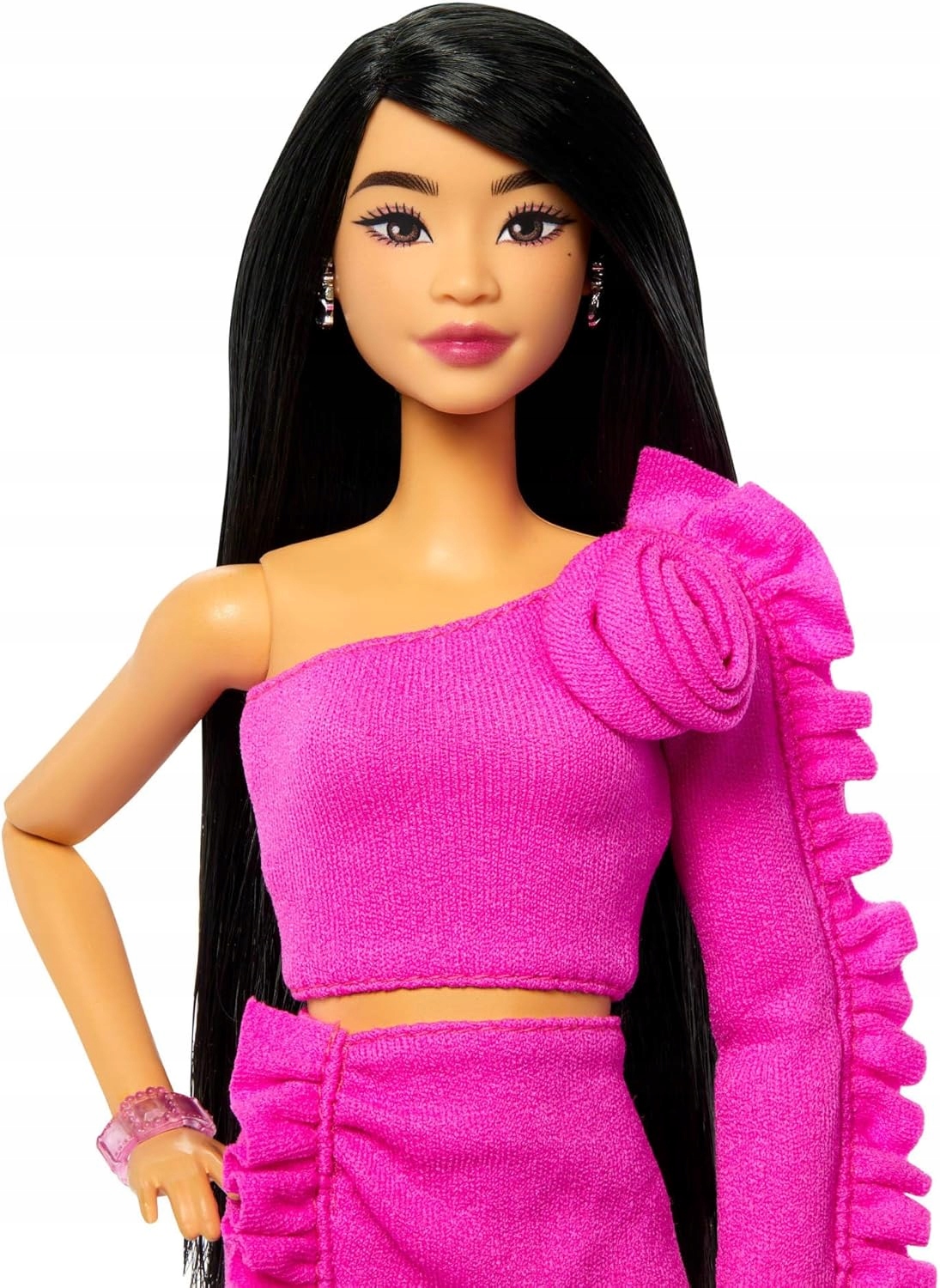 - ляльки barbie стилі розкішності дають новий вимір модних розваг красивих костюмів та витончених аксесуарів, натхненних естетикою Барбор ! Одягнений у її вражаючі троянди від ноги до ніг цієї ляльки barbie має пряме чорне волосся і паркотажний рожевий протез /b> з точкою згинання. і спідниці з фріллом і асиметричним зрізом. Сучасний стиль підкреслює троянди на плечі !