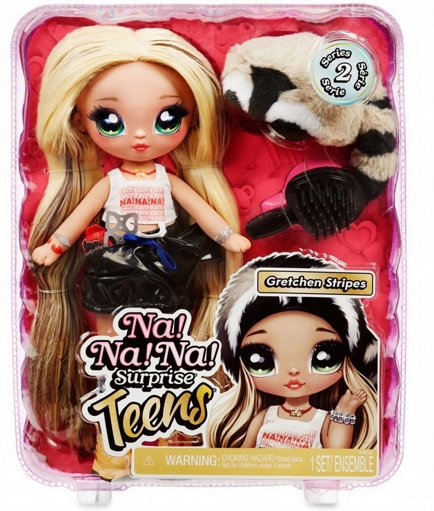 Na Na Na Surprise Teens Gretchen Stripes. Модна лялька Gretchen Stripes.Na Na Na Surprise Teens — це красиві, м’які модні ляльки заввишки 28 см із чудовим стилем та індивідуальністю. У Гретхен Страйпс довге світле волосся, одяг, пухнастий капелюх у стилі єнота та стильні туфлі з хвостом. Ідеальний подарунок! Він також містить бирку з її іменем і датою народження. Зберіть усі 5 красивих м’яких ляльок Teens Fashion.