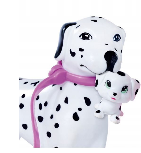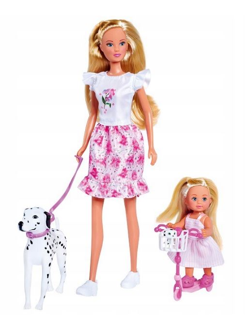 - ляльки піклуються про далматинців - Штеффі тримає собаку на фіолетовому повідку, а Еві катається на самокаті з цуценям