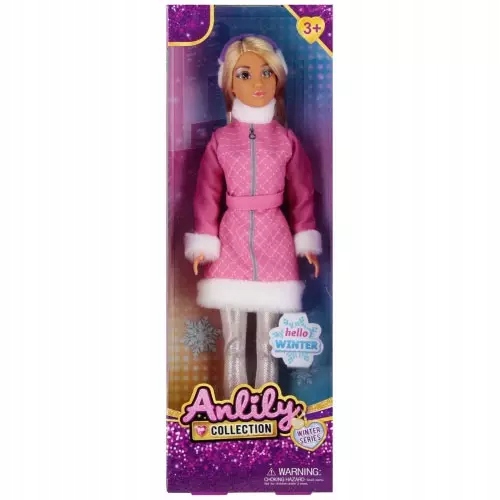 Лялька має рухомі руки та ноги, довге волосся, зимовий одяг.