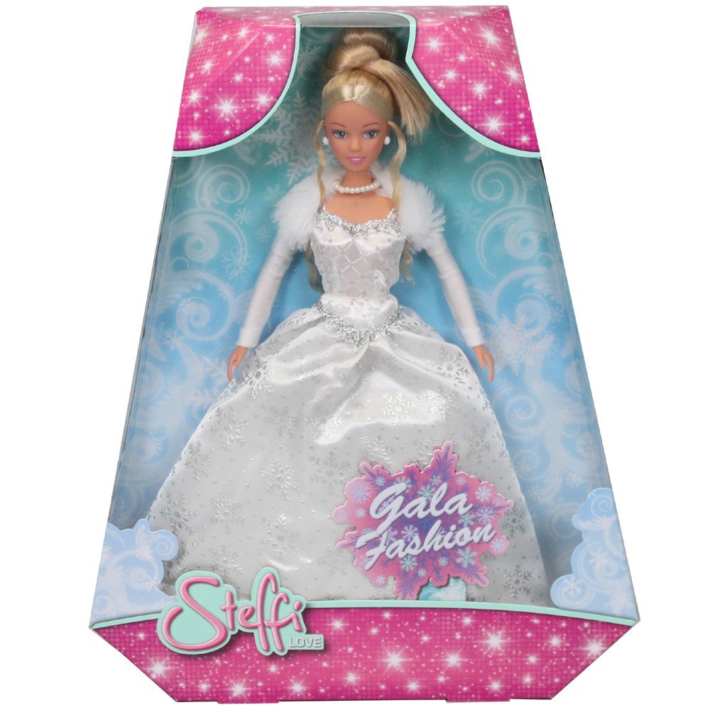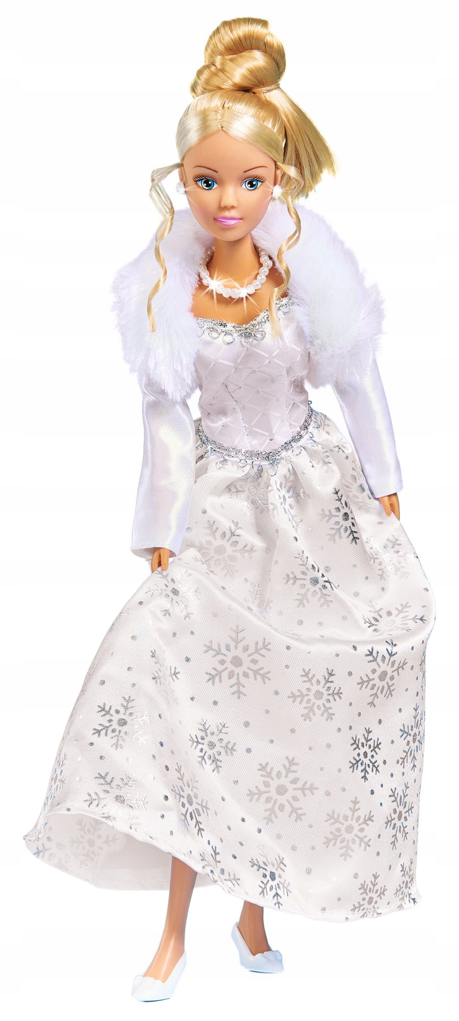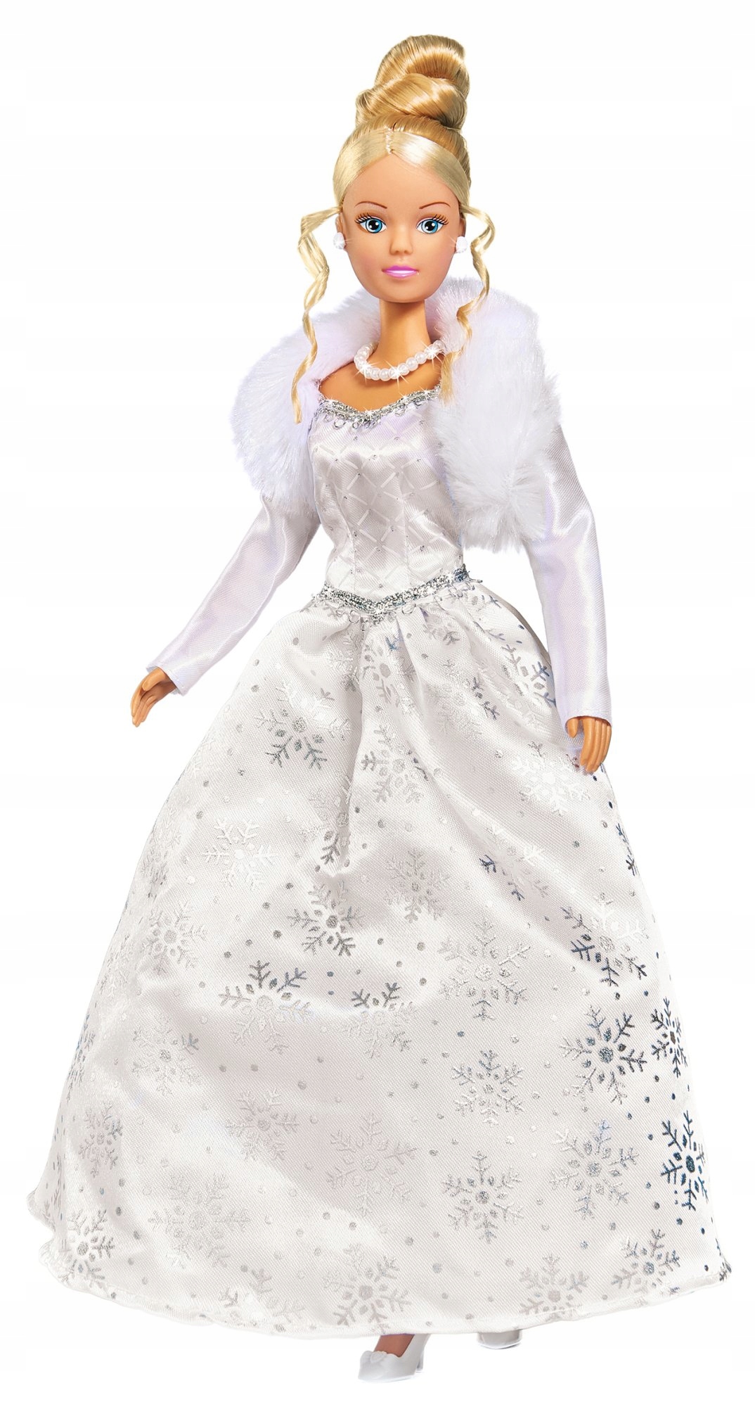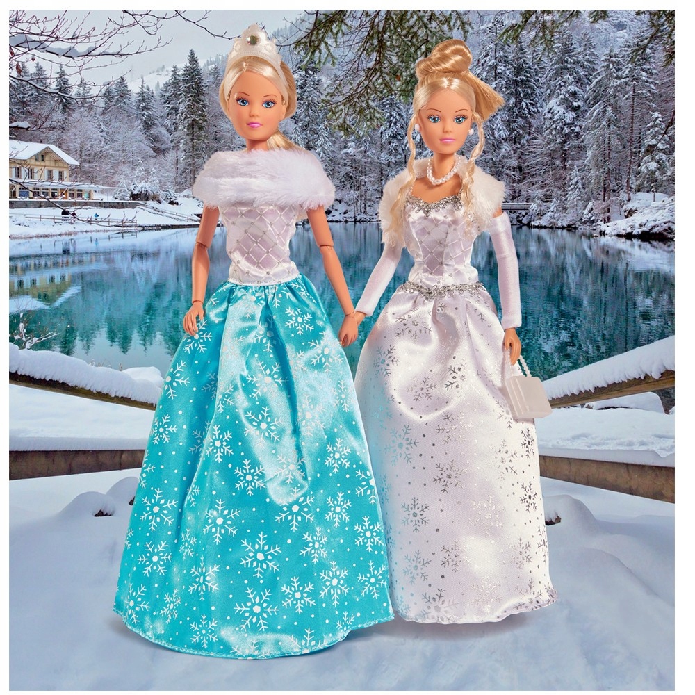 Лялька Steffi у чарівній зимовій версії. Красива бальна сукня зі сріблястими сніжинками, яка виблискує при кожному русі. Хутряне болеро додає наряду шику. На шиї перлинне намисто, а у вухах білі сережки.