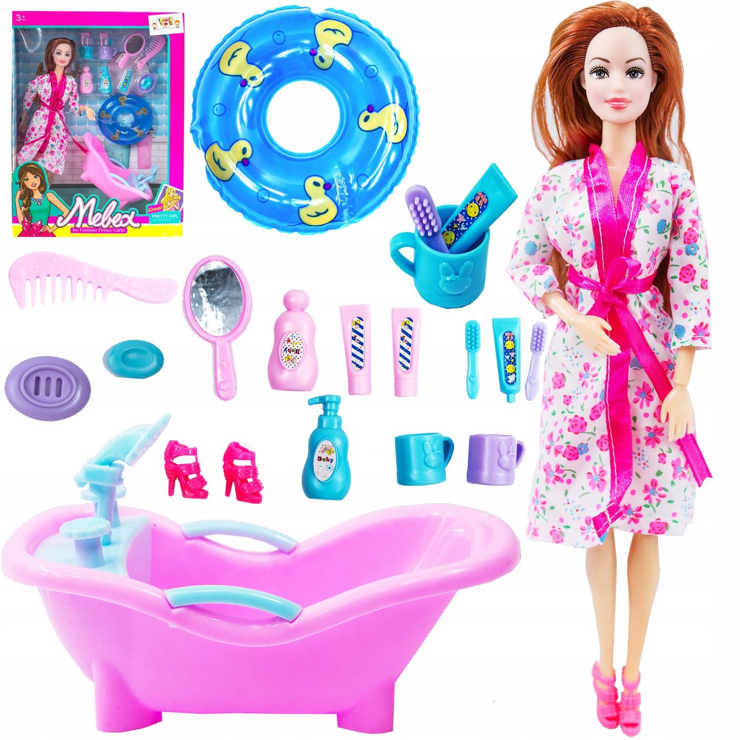 Красива лялька, одягнена в барвистий халат, готова до ранкового туалету у ванні. У набір входять необхідні аксесуари.
