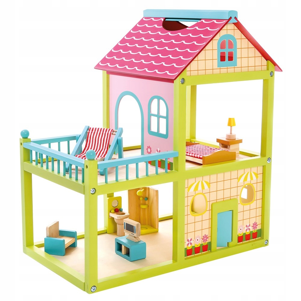 Великий дерев'яний ляльковий будиночок у барвистих кольорах - це гарна іграшка, яка викличе цікавість кожної дитини та надовго утримає її увагу! Ляльковий будиночок має терасу і меблі. Основні характеристики: Підтримує ігрові ідеї, будинок повністю відкритий для кращого задоволення Розміри: 50 см довжина x 32 x висота 55,5 см