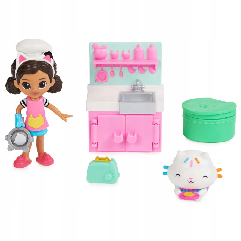 В Крім Габі в набір також входить фігурка Cakey Cat і кухонна тумба з мийкою і аксесуар-сюрприз.