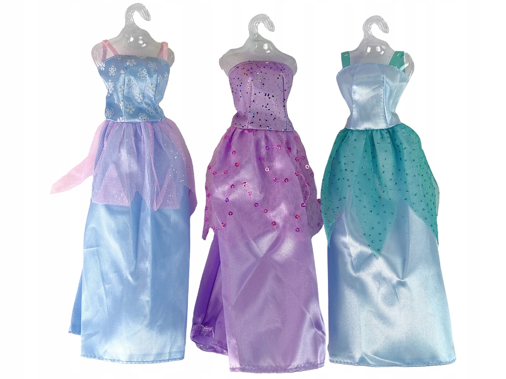 Ми знайдемо гарну ляльку з довгим світлим волоссям і 8 барвистих суконь з різними порізи та текстури матеріалів. Сумочка та взуття, що входять до набору, доповнять наш аутфіт.