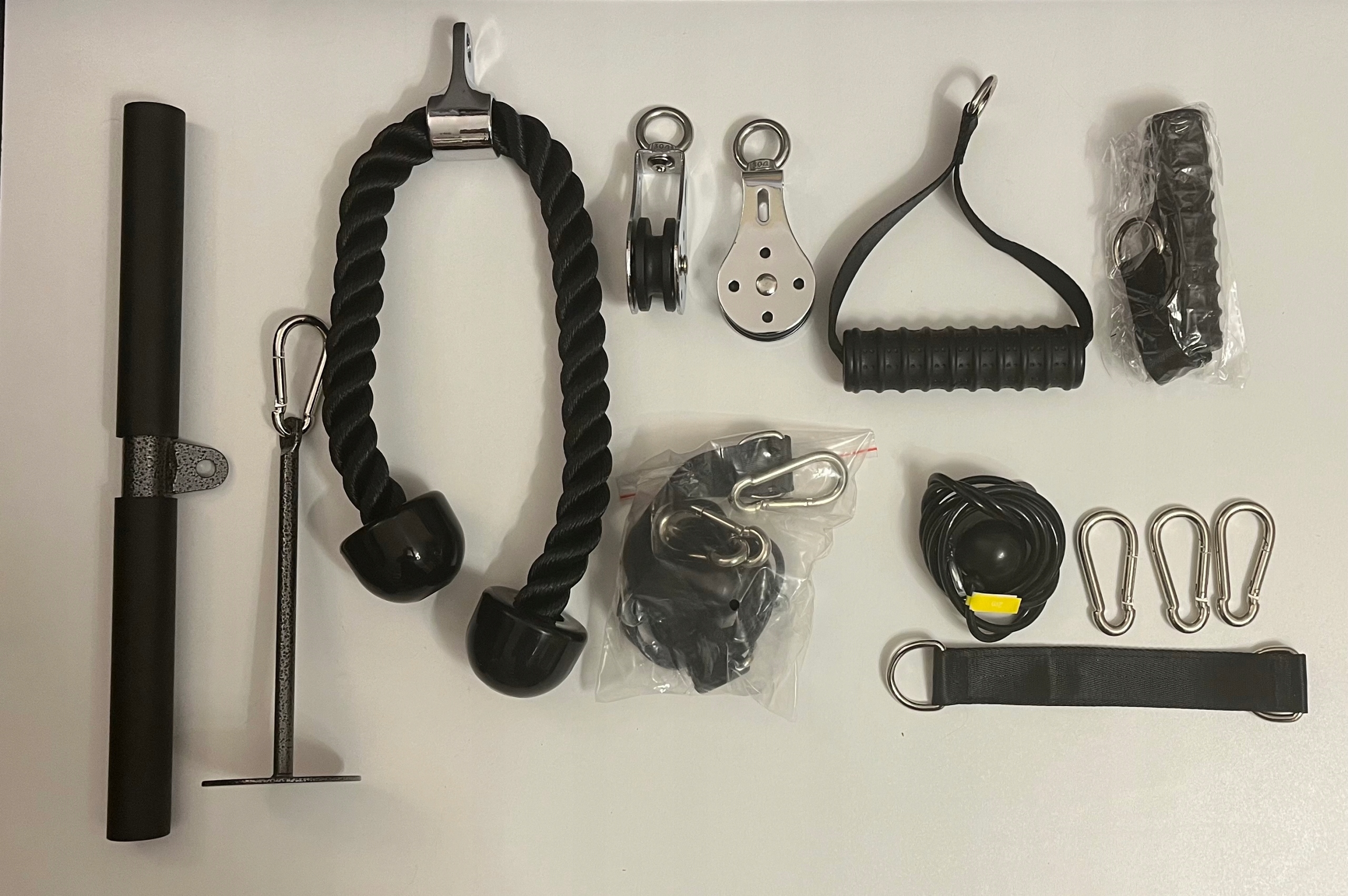 - Повна універсальність: три основні рукоятки (мотузка, штанга, D-подібні ручки) дозволяють тренувати біцепси, трицепси, спину, груди та прес, замінюючи кілька тренажерів.