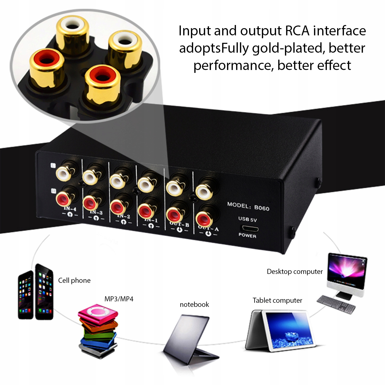 1. Універсальний перемикач вибору джерела звуку: Цей перемикач для вибору джерела звуку від 4 до 2 або 2 до 4 був розроблений для спрощення звукового досвіду, що дозволяє прості перемикання між багатьма джерелами введення, такими як телевізійні, MP3 -плеєри та інше за допомогою одного AV -перемикача.