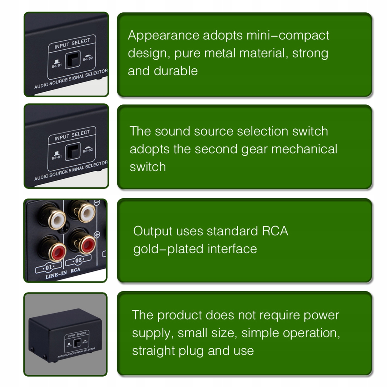- Оснащений з'єднаннями RCA та перемикачем кнопки 2-позиції.