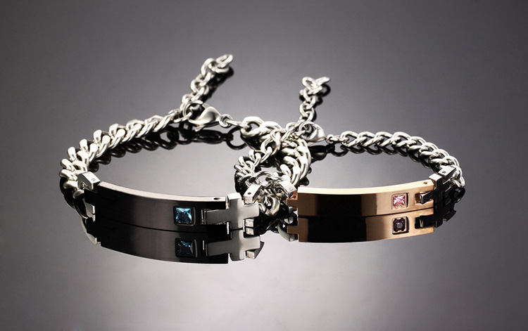 Пропозиція включає 2 браслети: Чоловічий браслет, покритий глибоким чорним кольором, з блискучим покриттям, з ідеально інтегрованим шестикутним цирконом. Жіночий браслет, позолочений 18-каратним рожевим золотом, ідеально полірована поверхня з красивим шестикутним рожевим цирконом.
