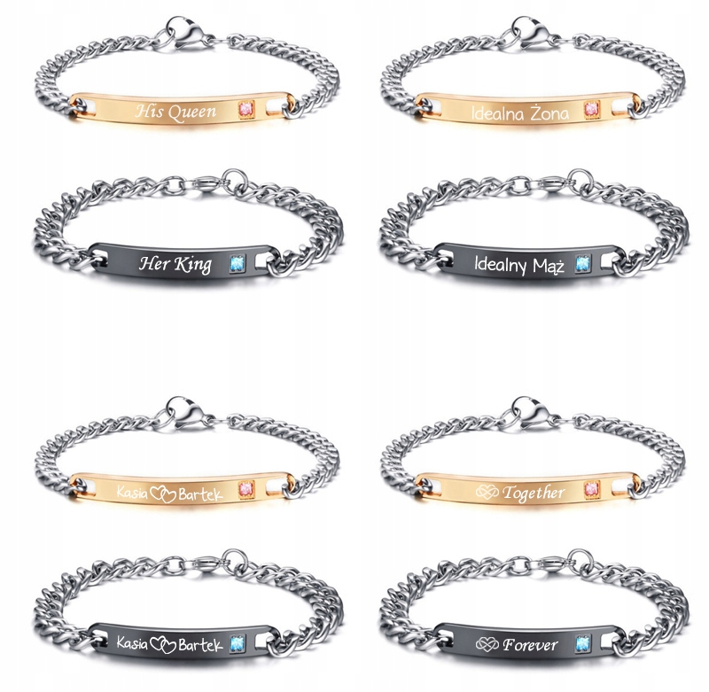 Оздоблення: блискуче сріблястий колір, золото і чорний кольори з покриттям міцним методом IP. Місце для гравіювання на браслетах