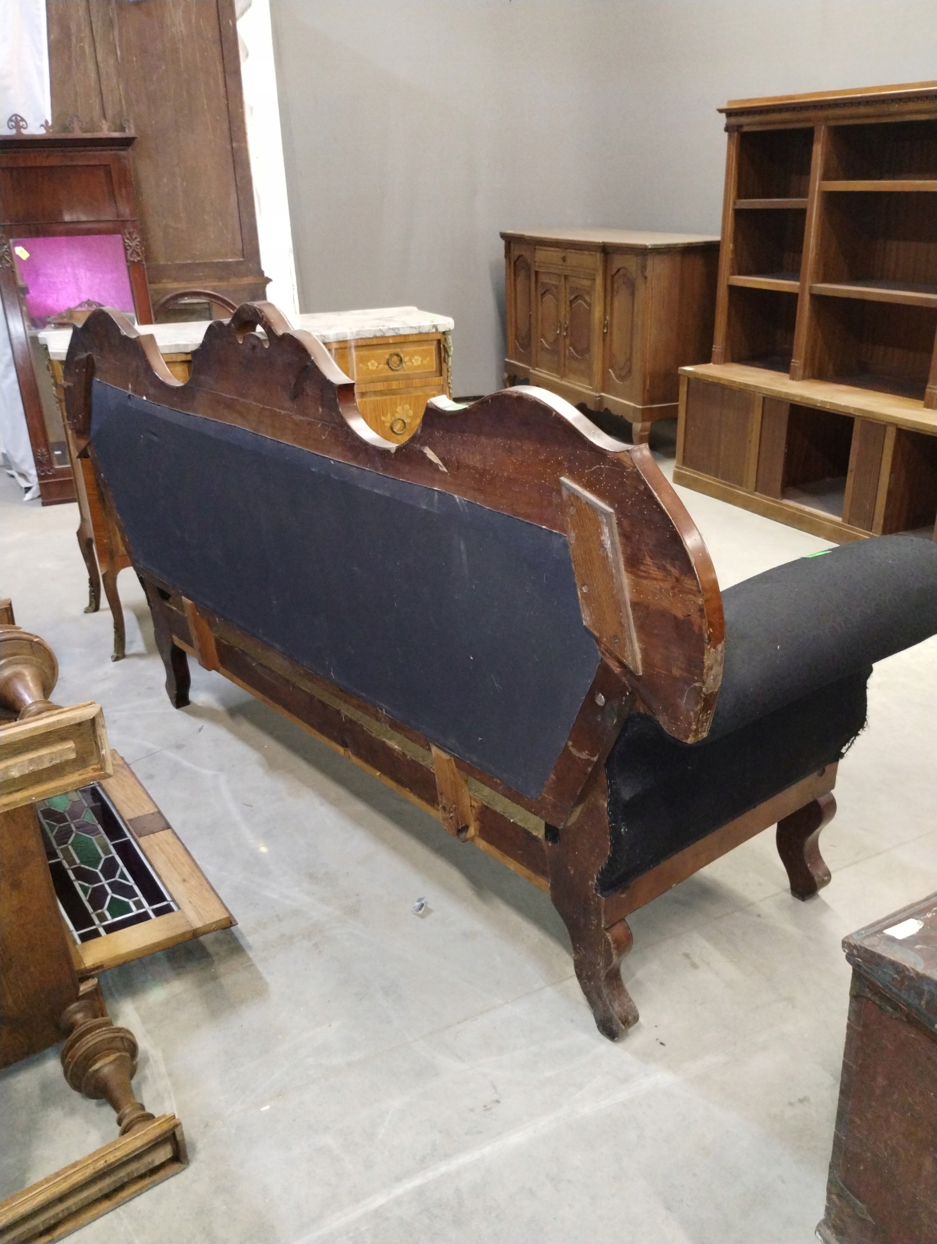 Диван середини 19 століття хоч і потребує ремонту, але радує своєю формою, яка ідеально вписується в характер бідермаєру, Луї-Філіпа та еклектичного інтер’єру. Походження з північної Німеччини, добротне виконання надає йому автентичного характеру, роблячи його справжнім антикваріатом з унікальним стилем. Розміри 200х67, висота 110.