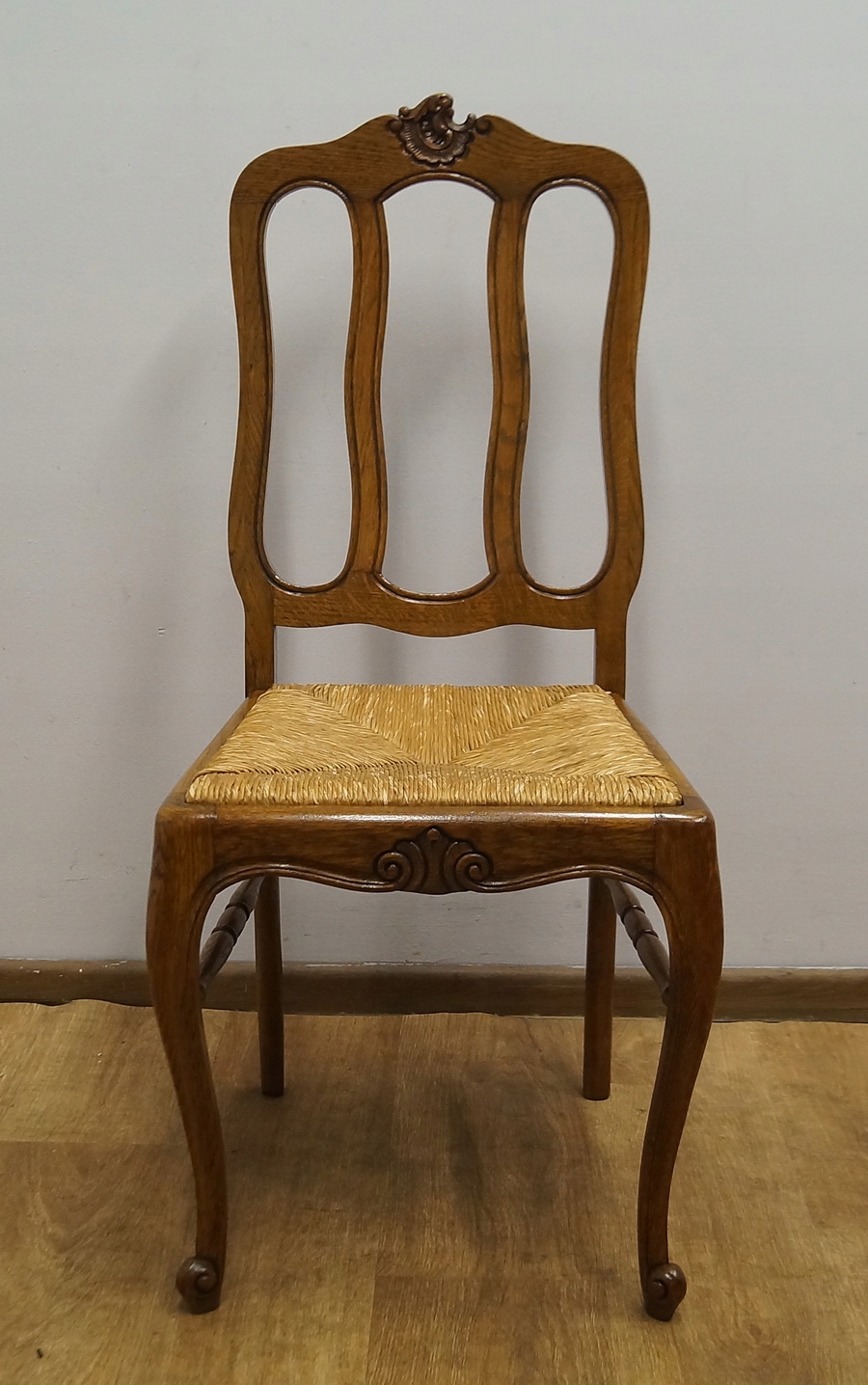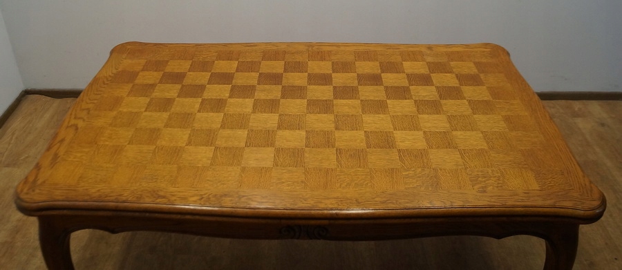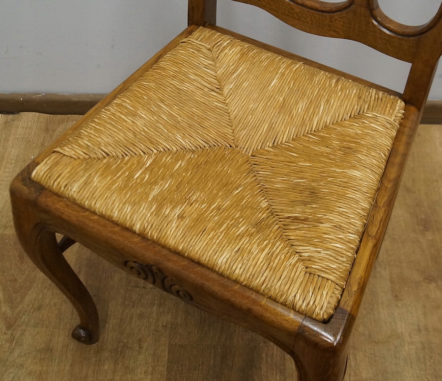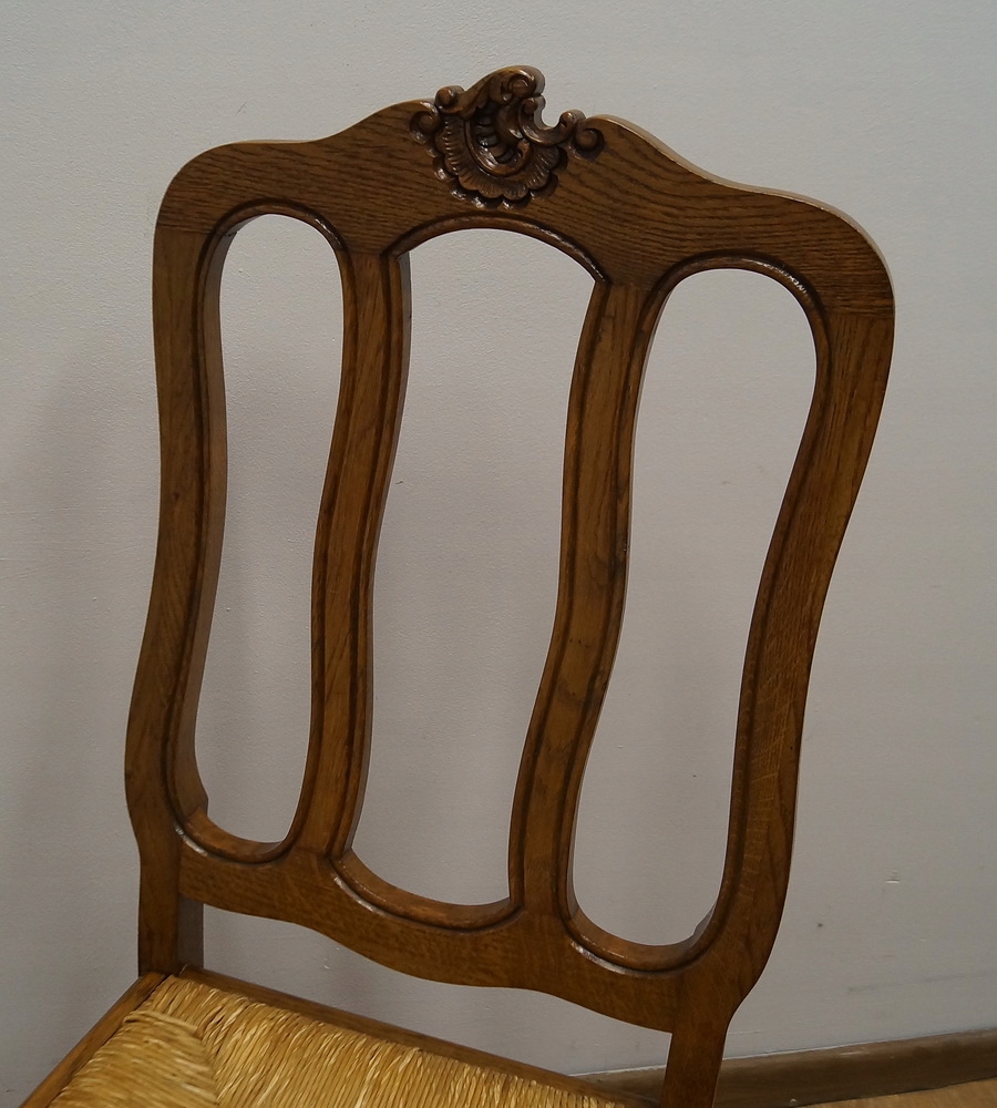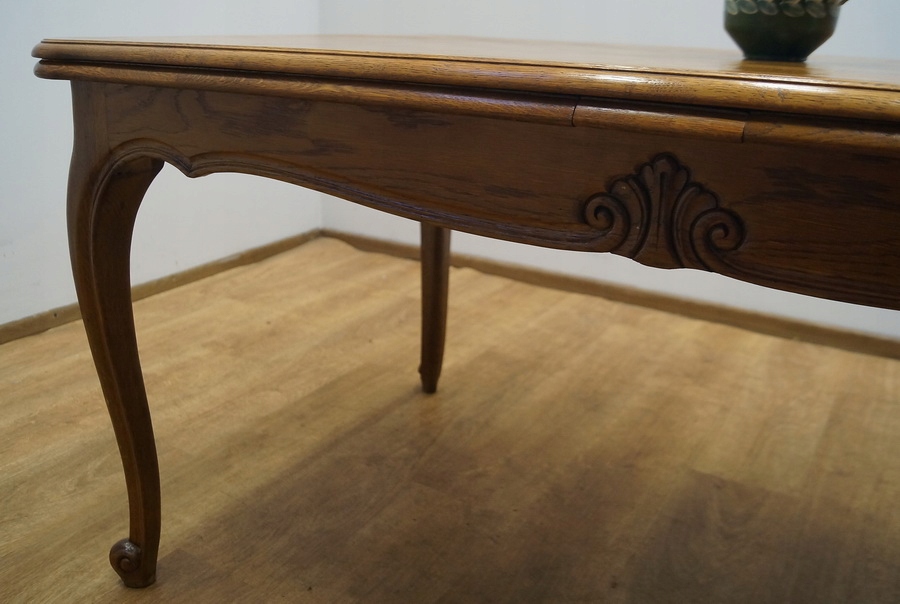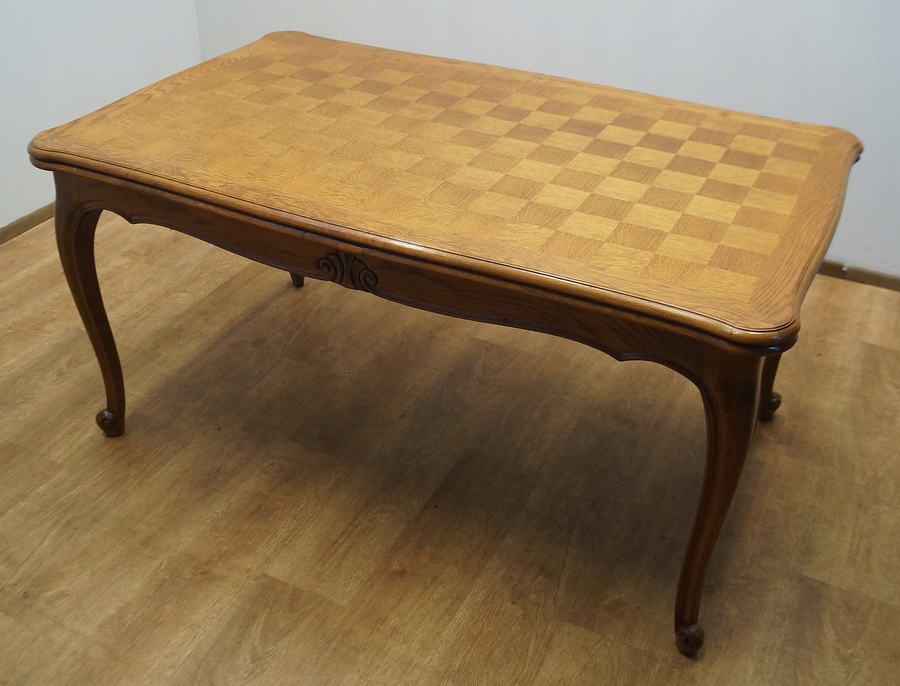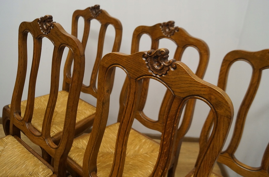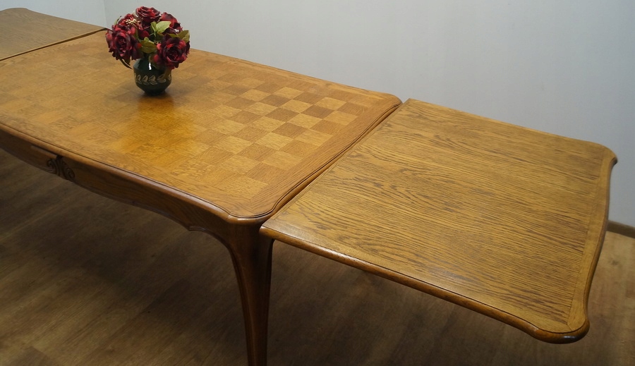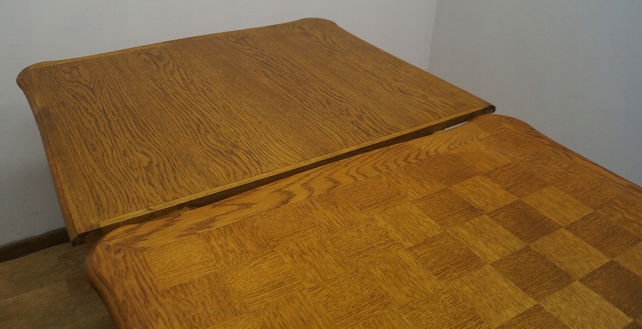 Стіл розсувний, дуже міцний і стійкий, з інкрустованою стільницею. Сидіння обшиті плетеною тростиною, спинки фантастичної форми.