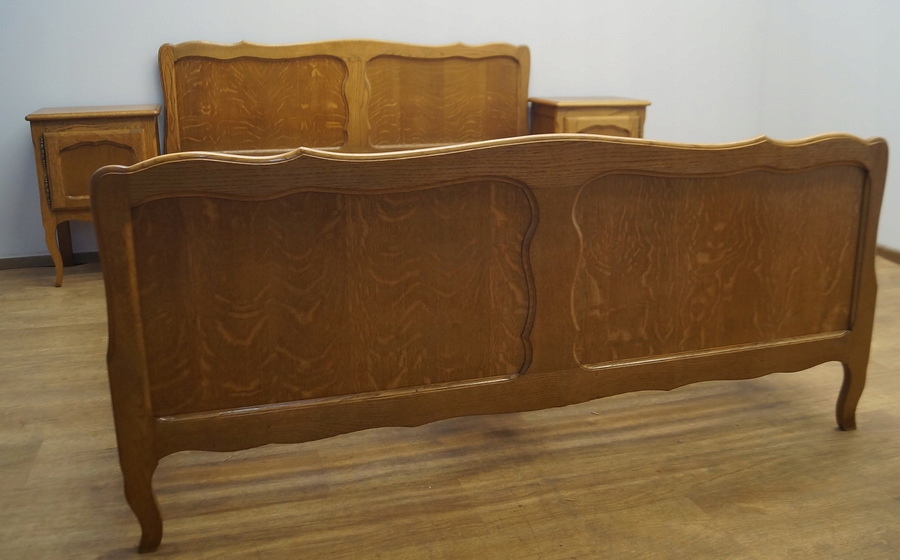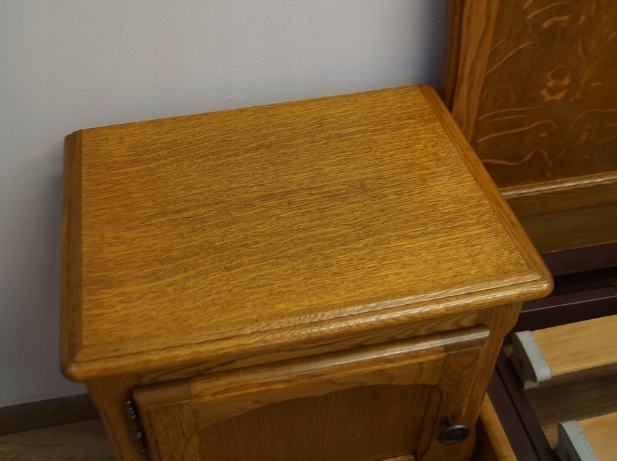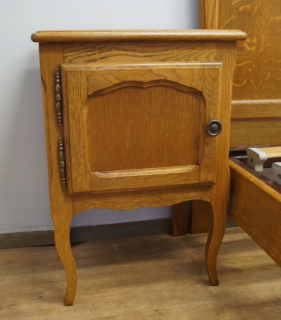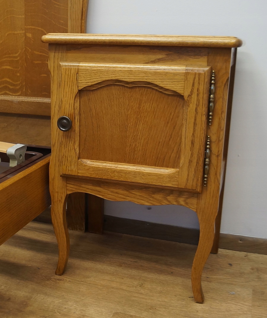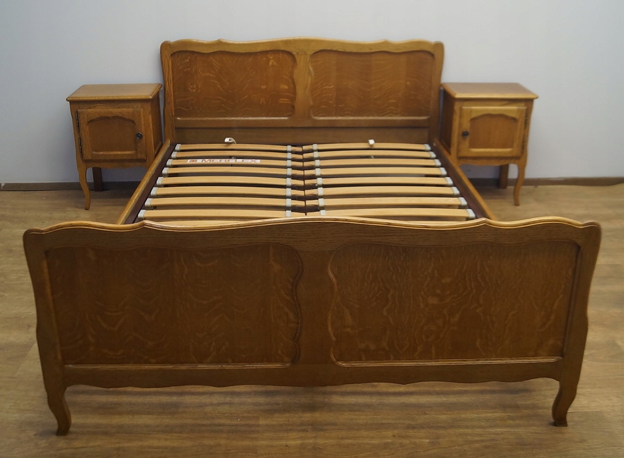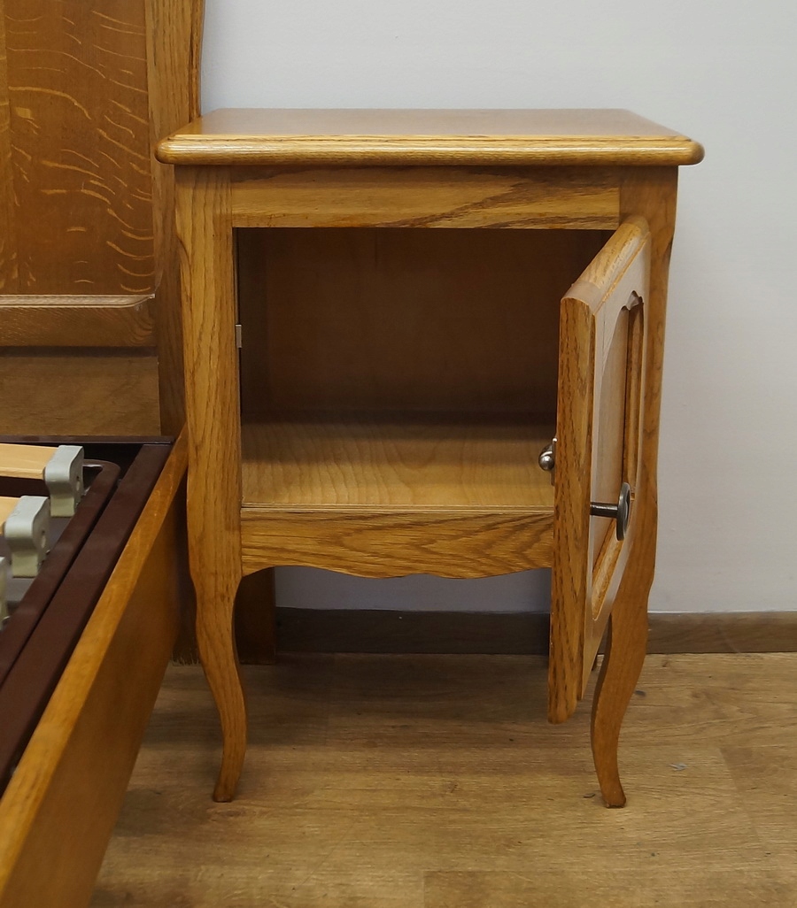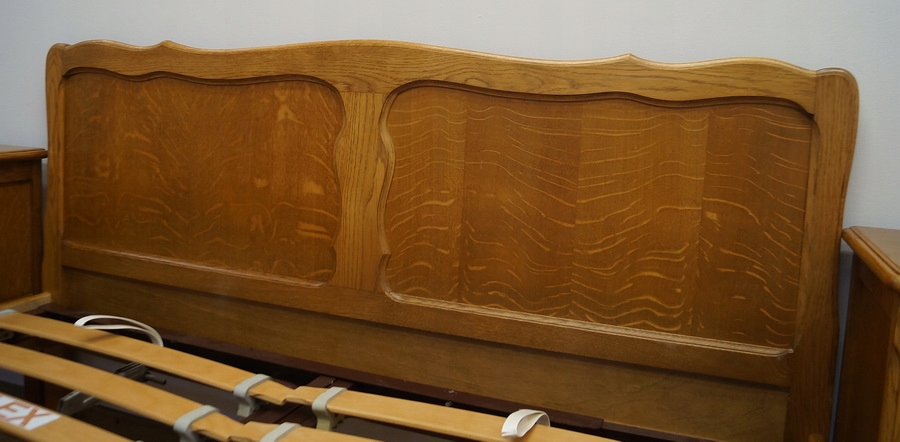 У набір входять дві чудово різьблені тумбочки та каркас ліжка. Каркас має регульований підголівник і підніжку.