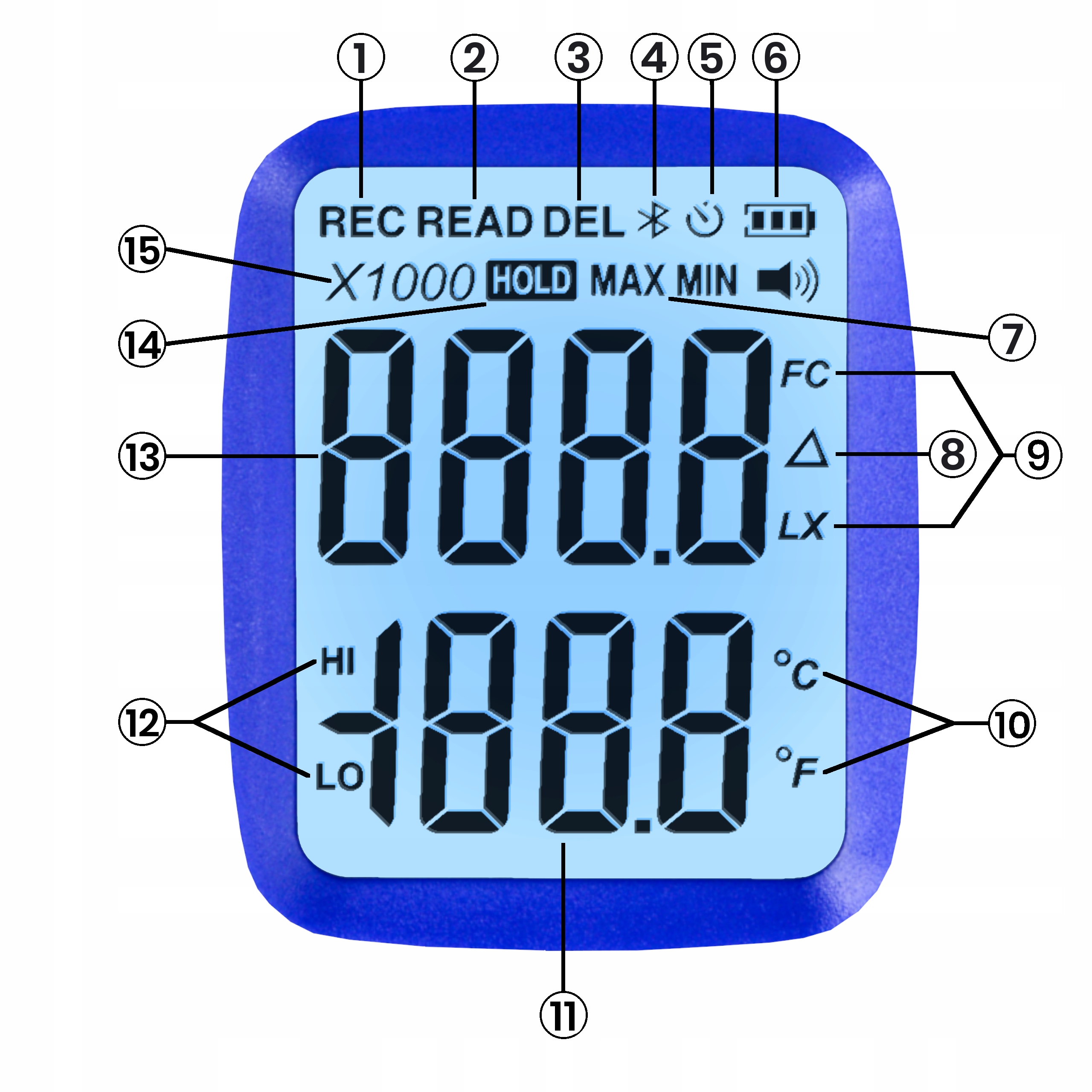 - Одиниці вимірювання освітлення та температури: люкс/℃; Люкс/℉; FC/℃; FC/℉