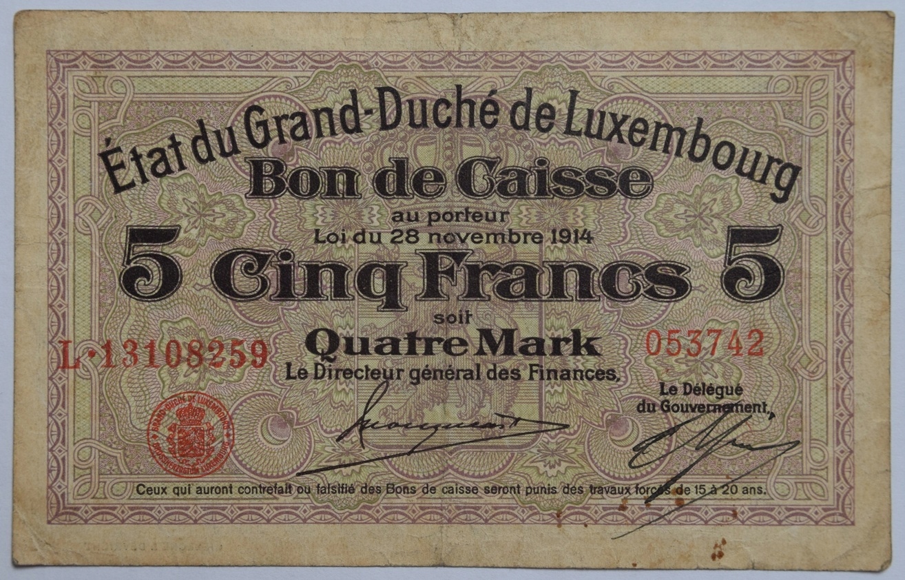 ЛЮКСЕМБУРГ - 5 ФРАНКІВ 1914 - РІДКІСНИЙ