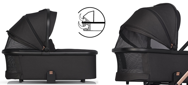 Інтер'єр гондоли виготовлений повністю з бавовни та оснащений м'яким матрацом, який забезпечує належну підтримку всього тіла дитини. Ви можете повністю скласти полог, щоб отримати легкий доступ для догляду за дитиною, або подовжити його, щоб захистити дитину від несприятливих умов, таких як вітер або яскраве сонце. Полог також оснащений спеціальними фільтрами UPF50+, які відбивають шкідливі сонячні промені, захищаючи тим самим крихітне тільце дитини. У комплект також входить дощовик на всю гондолу, який захистить всю оббивку і дитину всередині, якщо під час прогулянки вас несподівано застане злива.