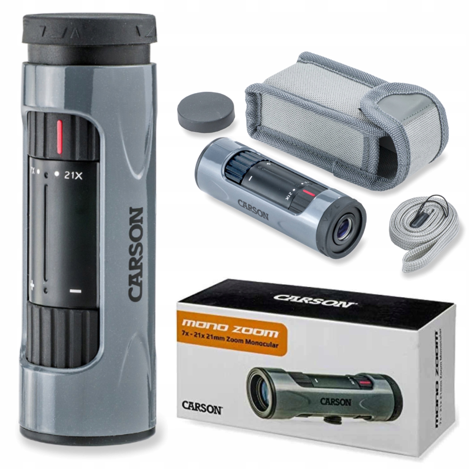 Регульоване збільшення від 7x до 21x. Монокуляр пропонує широкий діапазон збільшення, яке можна плавно регулювати залежно від ваших потреб. Це дозволяє точно спостерігати як за віддаленими, так і за ближчими об’єктами без необхідності змінювати обладнання. Це ідеальне рішення, коли ви хочете наблизитися до природи або спостерігати за архітектурними деталями з більшої відстані.Компактний і легкий дизайн. Монокуляр Carson MonoZoom 7-21x21 важить лише 162 грами та має ергономічну форму, тому легко поміститься в кишеню, рюкзак або сумку. Це ідеальний компаньйон у будь-якій подорожі – його легко носити з собою та завжди готовий до дії.Високоякісна оптика. Оснащений 21-мм об’єктивом і високоякісним оптичним покриттям, монокуляр Carson забезпечує яскраве, чітке та різке зображення, що є вирішальним під час спостереження за слабкого освітлення. Багатошарове покриття лінз забезпечує максимальне пропускання світла, зменшуючи відблиски та забезпечуючи чіткість зображення.Просте керування - Завдяки великій центральній ручці фокусування монокуляр легко швидко налаштувати, що дозволяє швидко й точно налаштовувати зображення. Лише миті достатньо, щоб отримати ідеально чітке зображення спостережуваного об’єкта.Стійкість і стійкість. Монокуляр Carson MonoZoom 7-21x21 розроблено з урахуванням довговічності. Міцна конструкція та високоякісні матеріали роблять його стійким до ударів і ударів, що робить його ідеальним інструментом як для аматорів, так і для професіоналів у складних польових умовах.Універсальне використання - ідеально підходить для різноманітних застосувань, таких як спостереження за птахами, дикою природою, спортивні та культурні заходи. Він також добре працюватиме в ситуаціях, що вимагають точного спостереження з більшої відстані.