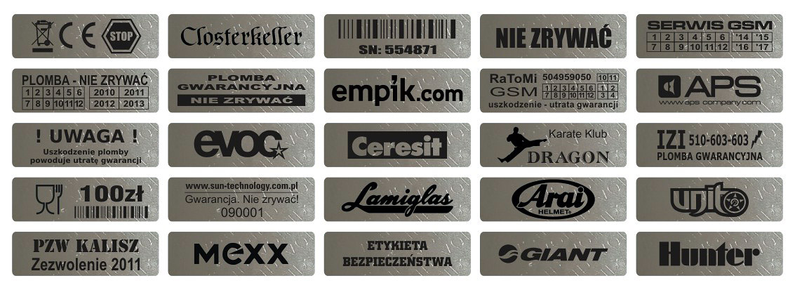 Пломби з поліестеру блискучого срібла - дзеркальний ефект. Після відклеювання на етикетці з’являється напис VOID. Печатки також залишають написи на охоронюваному предметі. Фольга проводить електричний струм і тому не підходить для використання на друкованих платах та електронних компонентах. Стійкий до атмосферних і хімічних факторів. Ідеально підходить для наклеювання на плоскі та злегка вигнуті поверхні та на стиках різних елементів. Забруднені поверхні необхідно очистити і знежирити перед нанесенням ущільнювача. Клей повністю твердне і стає повністю функціональним протягом 24 годин. від наклеювання етикетки.