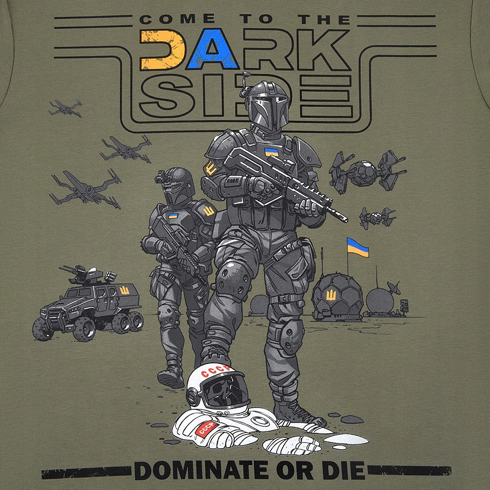 У головній частині друку на грудях є напис "Перейдіть на темну сторону", а внизу "Домінуй або Згана" з початковим зображенням українських космонавтів зі зброєю, що стоїть на трупі радянських ворогів. На рукавах, з одного боку, є прекрасний логотип "m-tac ua", а з іншого-герб України, де ви можете побачити "Темну сторону". Футболка найкраще працює під час активного відпочинку та спорту, тому вона працює для мисливців, рибалків, туристів та любителів різних видів спорту. Тонкий гнучкий і високоякісний триток ефективно підкреслює переваги фігури та дає відчуття повного комфорту.