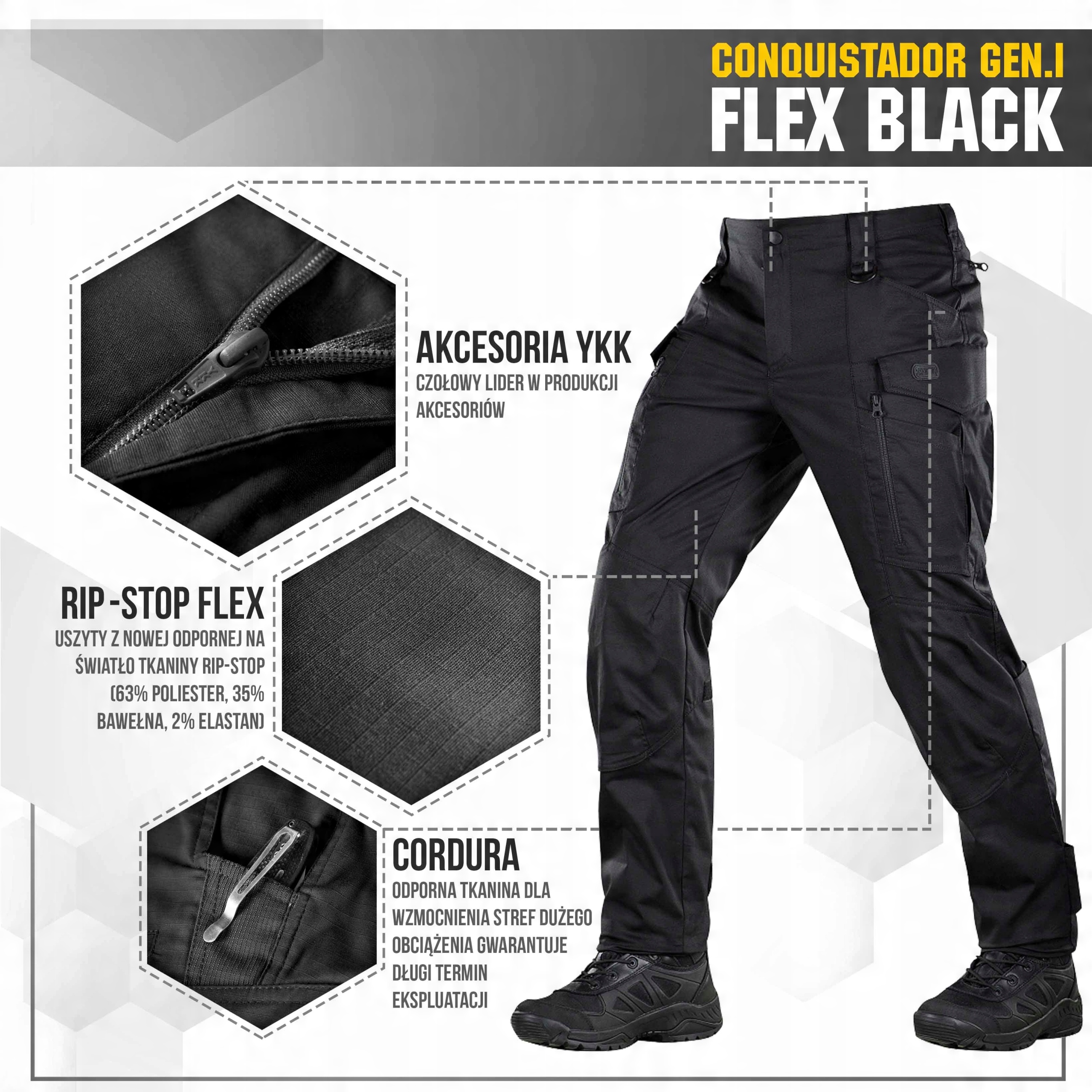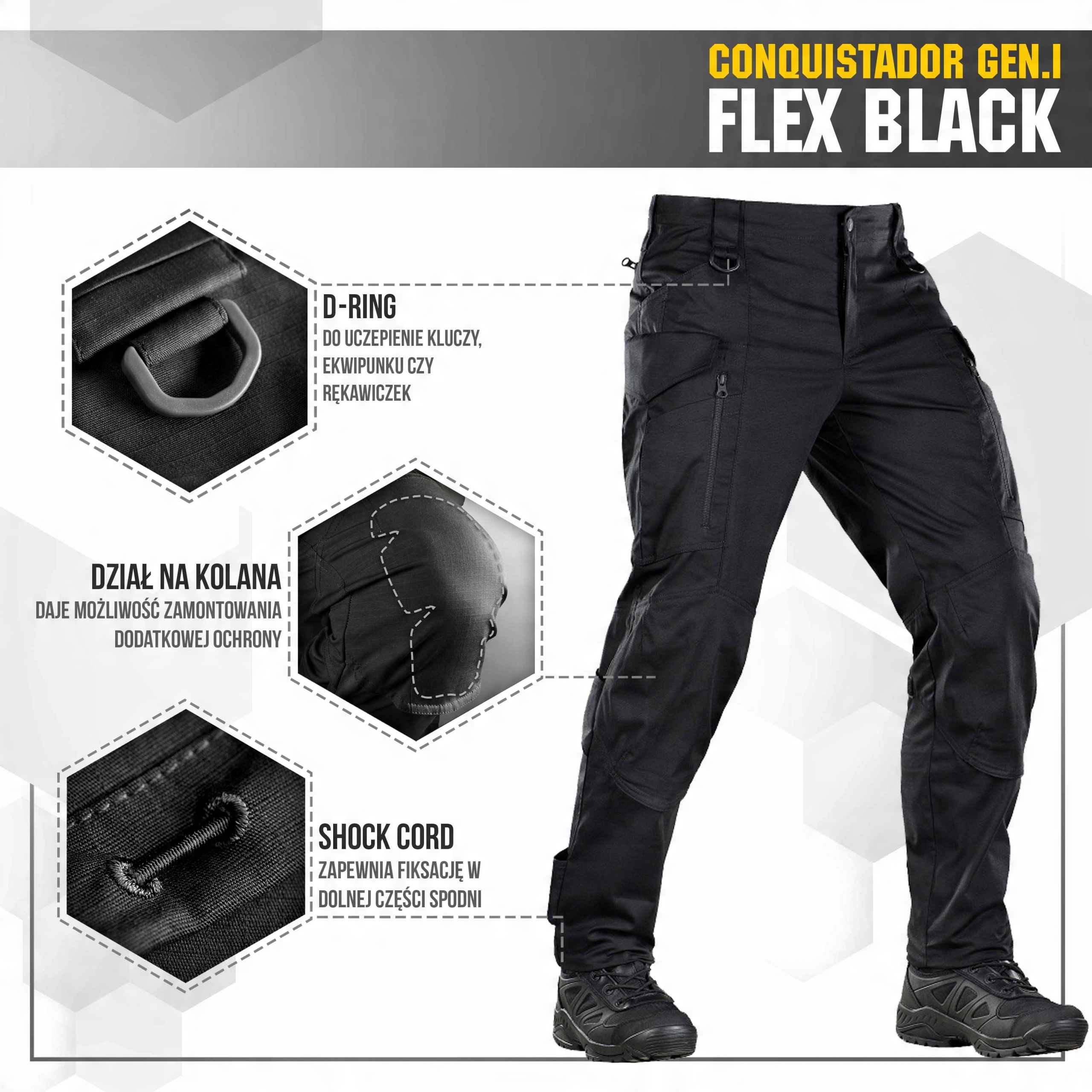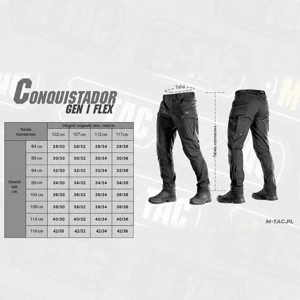 Особливістю дизайну штанів Conquistador Flex є вставка з еластичного матеріалу на талії та в районі бічних кишень штанів, завдяки чому штани не заважають. з нахилом вперед і прогином. Вони не сковують рухів і з легкістю виконують як тактичні, так і повсякденні завдання одягу.