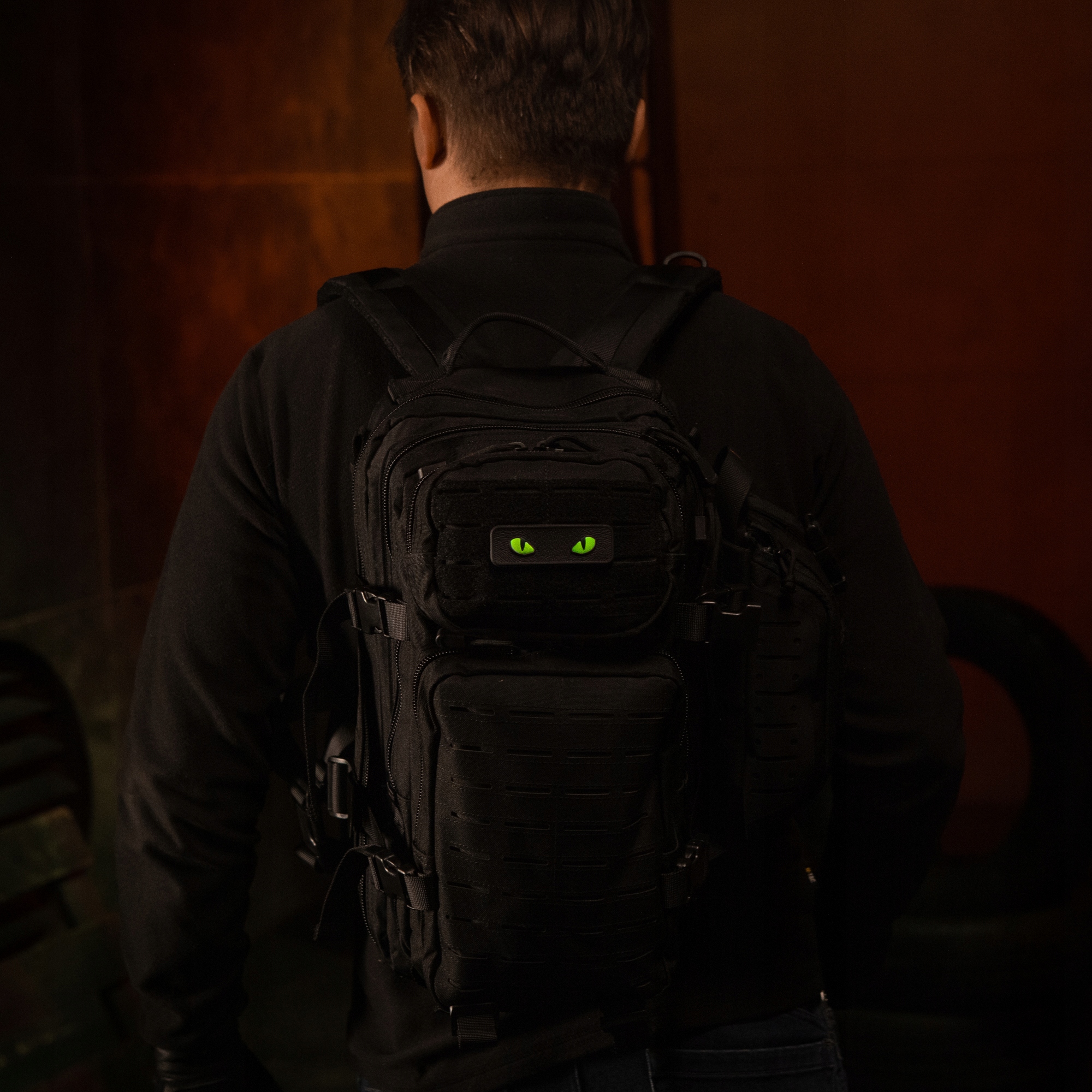 Флуоресцентний патч M-Tac Cat Eyes Laser Cut - т.зв «Morale patch» — кріпляться на бейсболку або рюкзак за допомогою липучок (липучка пришита на звороті самої нашивки). Зображення виготовлено з фосфоресцентного матеріалу, який світиться в темряві. Ця нашивка виготовлена з гуми з 3D рельєфним зображенням.