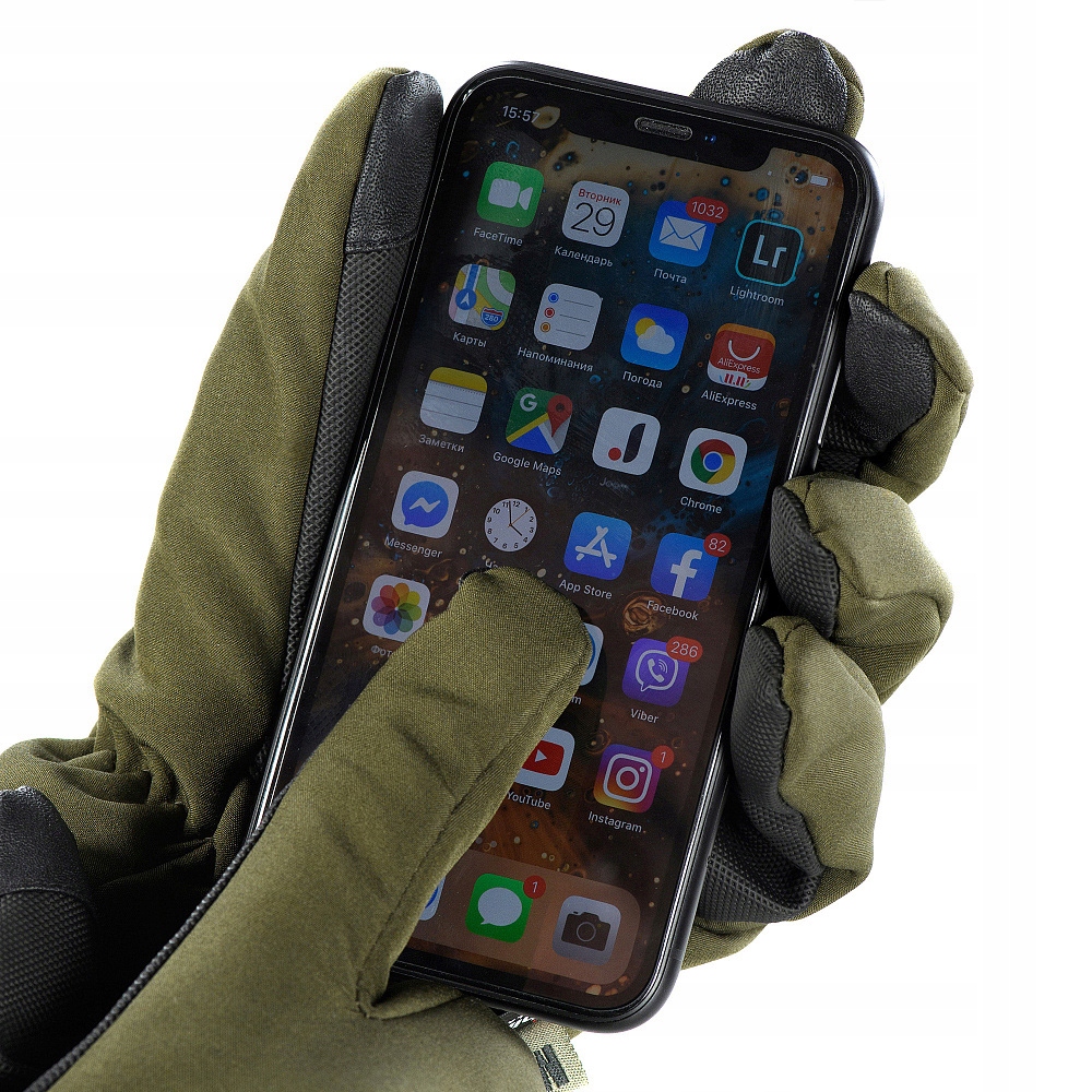 Завдяки зовнішньому матеріалу рукавички ідеально захищають від вітру, снігу чи вологи, при цьому швидко висихаючи. Площа руки додатково посилена для запобігання передчасного зносу, поліпшення адгезії та запобігання ковзанню. Накладка сенсорного екрана на вказівному пальці дозволяє використовувати смартфони сенсорних екранів, навігаторів gps та планшетів без зняття рукавичок.