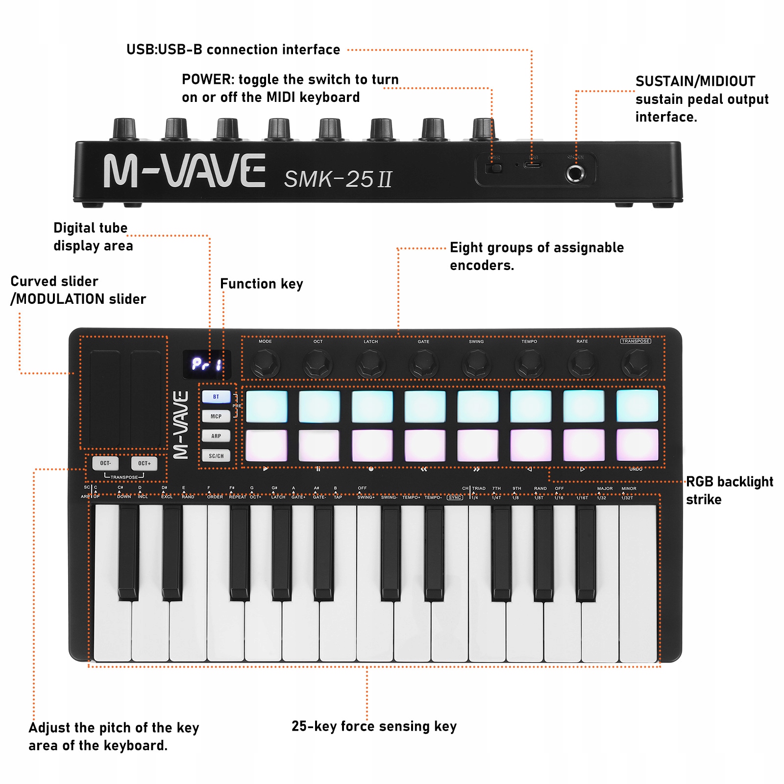 🎹 MIDI M-VAVE SMK-25 II Контролер клавіш-25 Клавіші Професійний інструмент для виробництва музики (чорний)