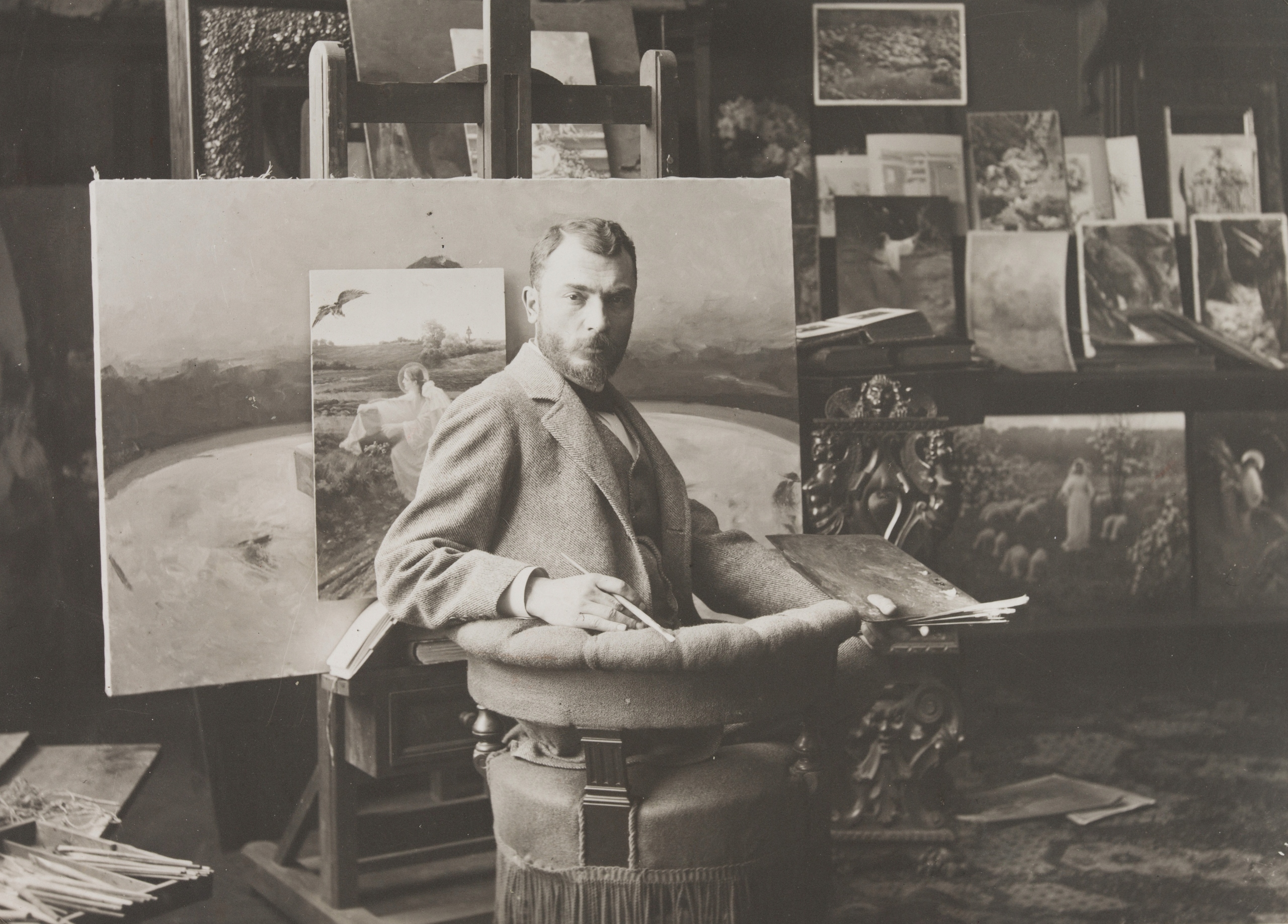 Пьотр Стахєвич (1858 - 1930)польський художник та ілюстратор, народився в Новосіолках Госцінне на Самборщині. У 1877-1883 роках навчався в Краківській школі красних мистецтв у Яна Матейка, Владислава Лущкевича та Флоріана Цинека. У 1883-1885 роках він продовжив навчання в Мюнхенській академії у Отто Зайца. З 1885 постійно жив у Кракові. Здійснив подорож до Італії та Палестини. Багато років був президентом TPSP у Кракові. У живописі використовував переважно техніку олії та пастелі. Темою його творів були жанрові та релігійні сцени, портрети дівчат, особливо відомі зображення «красуні Зоськи», для якої йому позувала селянка Зофія Палухова. Найбільшу популярність він здобув завдяки, зокрема, ілюстраціям до романів. до «Легенд про Діву Марію», до «Трилогії» та «Quo Vadis» Сенкевича, до поезії Міцкевича та Марії Конопницької. Він також був піонером польського художнього плакату.