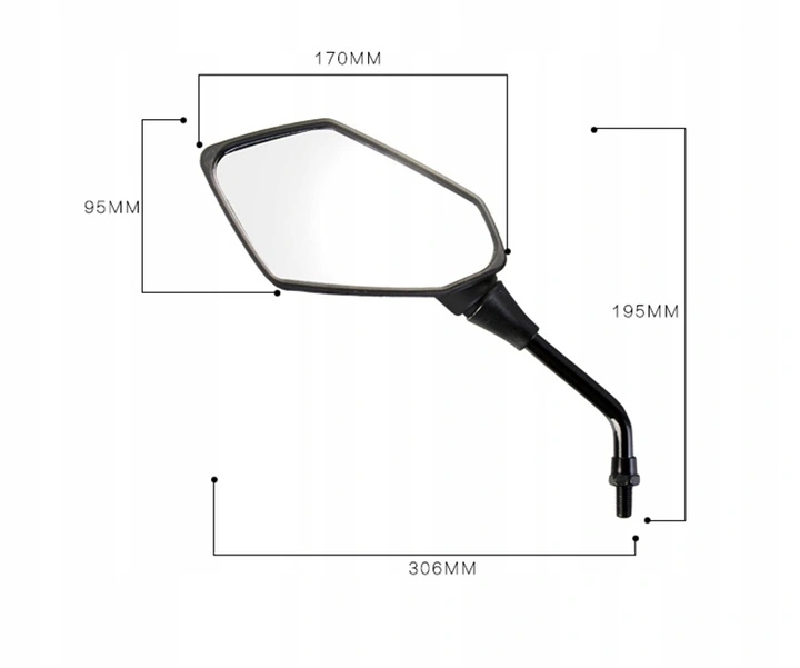 Дзеркала чорні матові з сучасний дизайн. Вони кріпляться на міцному металевому тримачі з діаметром різьби 10 мм. Вони мають можливість артикуляції кута огляду, завдяки чому можна індивідуально налаштувати параметри під свої потреби. Вони оснащені отворами для стоку води.
