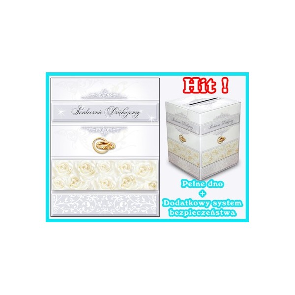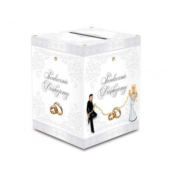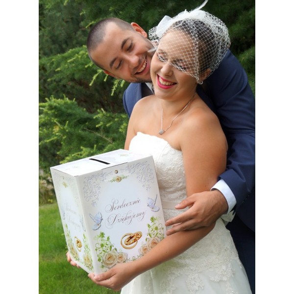 Декоративна коробка для конвертів з грошима з СИСТЕМОЮ ЗАХИСТУ і ПОВНИМ ДНОМ. Наше технічне рішення ускладнює відкриття скриньки сторонніми особами і захищає її від випадкового відкриття!Вам більше не потрібно хвилюватися, що конверт випадково залишиться в кишені свідка або загубиться під час весільної метушні. Усі конверти з самого початку будуть в одному безпечному місці. Більше не запихайте конверти по кишенях! Коробка має зручний, досить широкий отвір для вкладення конвертів. Виготовлена з жорсткого щільного картону, додатково покритого лаком. Для забезпечення максимальної безпеки конвертів, що зберігаються, коробка має повне дно і, абсолютно нові, два додаткових захисту від випадкового відкриття. СИСТЕМА БЕЗПЕКИ захищає як верхній, так і нижній люк. Щоб дістатися до грошей, просто підняти клапан недостатньо :-) Приблизний розмір ящика: 24x24x30 см.