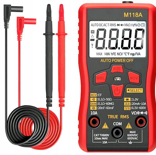 Apeng M118a - це цифровий мутим з автоматичною зміною вимірювальних діапазонів. M118a - це цифровий лічильник з автоматичним скануванням з фактичним ефективним значенням вартістю 6000 підрахунків типу 3 5/6 цифр. M118A автоматично розпізнає та вимірює відповідно до різних вхідних напруг/струму/опору/тощо. Сигнали. M118a характеризується стабільною продуктивністю, високою точністю та чітким читанням. M118a також має додаткові зручні функції ліхтарика та тест на напругу, що не відповідає контракту, M118a -ідеальний інструмент та прилад, придатні для фабрик, викладачів та ентузіастів електроніки