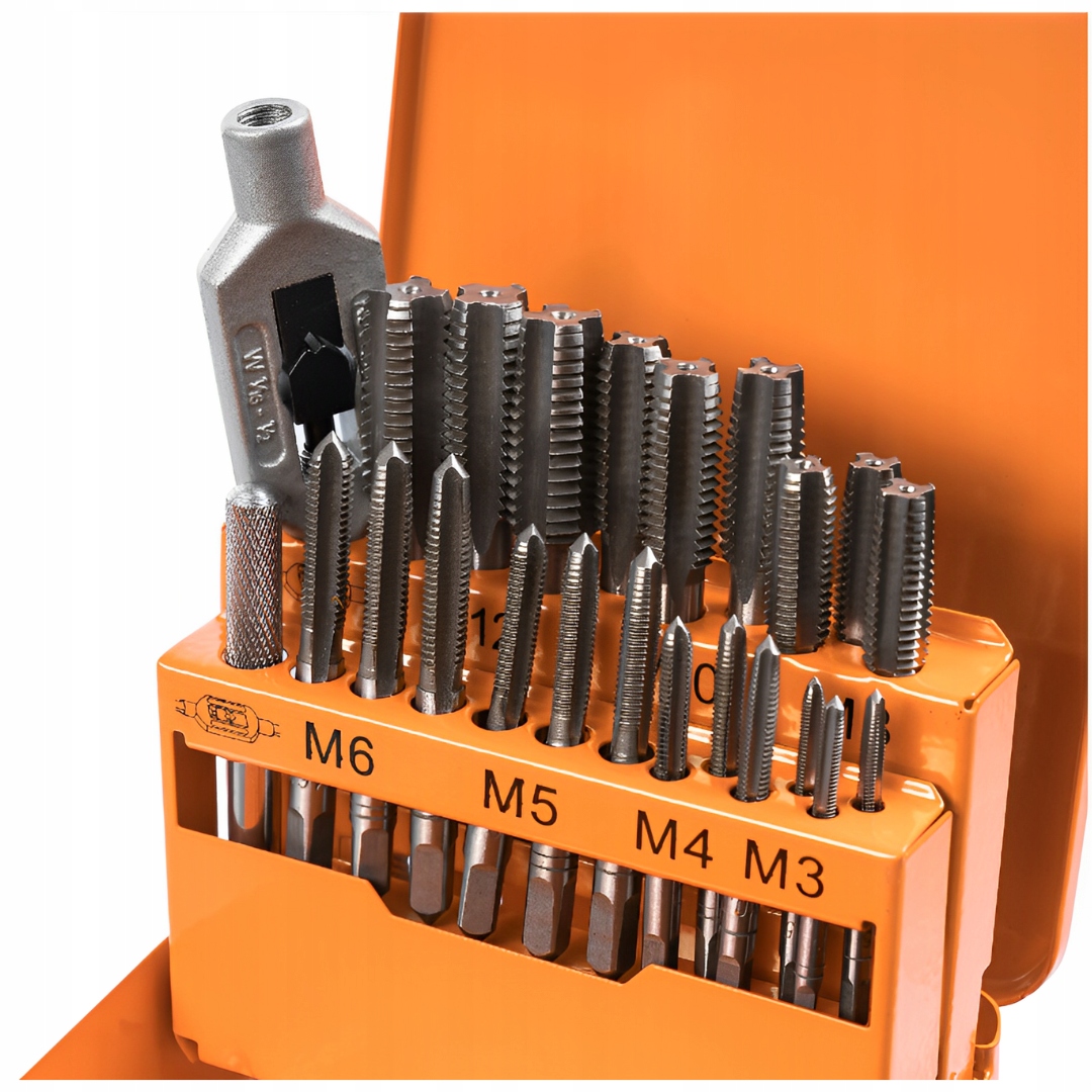 ➡️ Зручний набір мітчиків М3-М12, що складається з 22 елементів, включаючи 7 мітчиків і суцільну ручку.