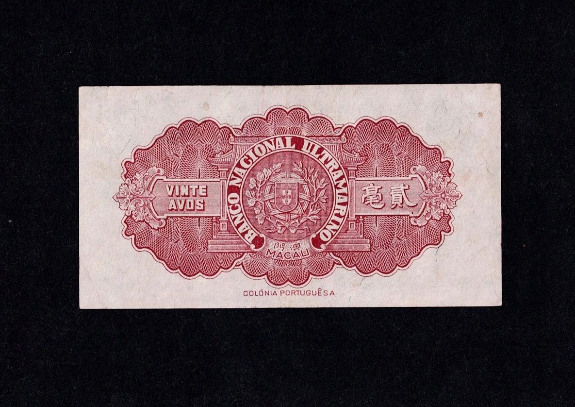 MACAU, BANCO NACIONAL ULTRAMARINO MACAO 20 AVOS 1946 P-37 VF++/ XF RZADKI