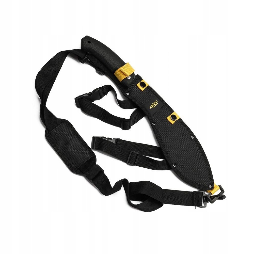 Для носіння мачете ми отримуємо зручні піхви з міцного нейлону. Піхви мають регульований ремінь, який дозволяє зручно носити мачете на спині чи плечі, а також два додаткових ремені, які стабілізують кукрі на стегні (при носінні на поясі).