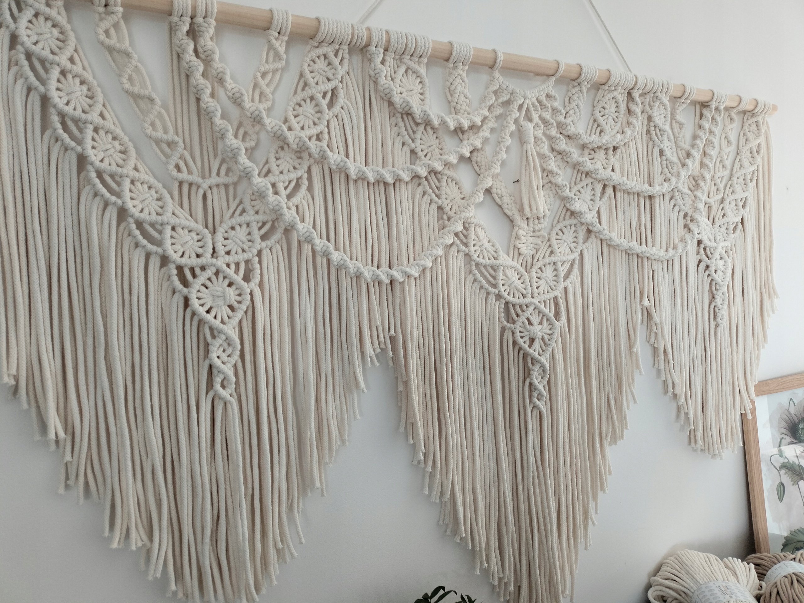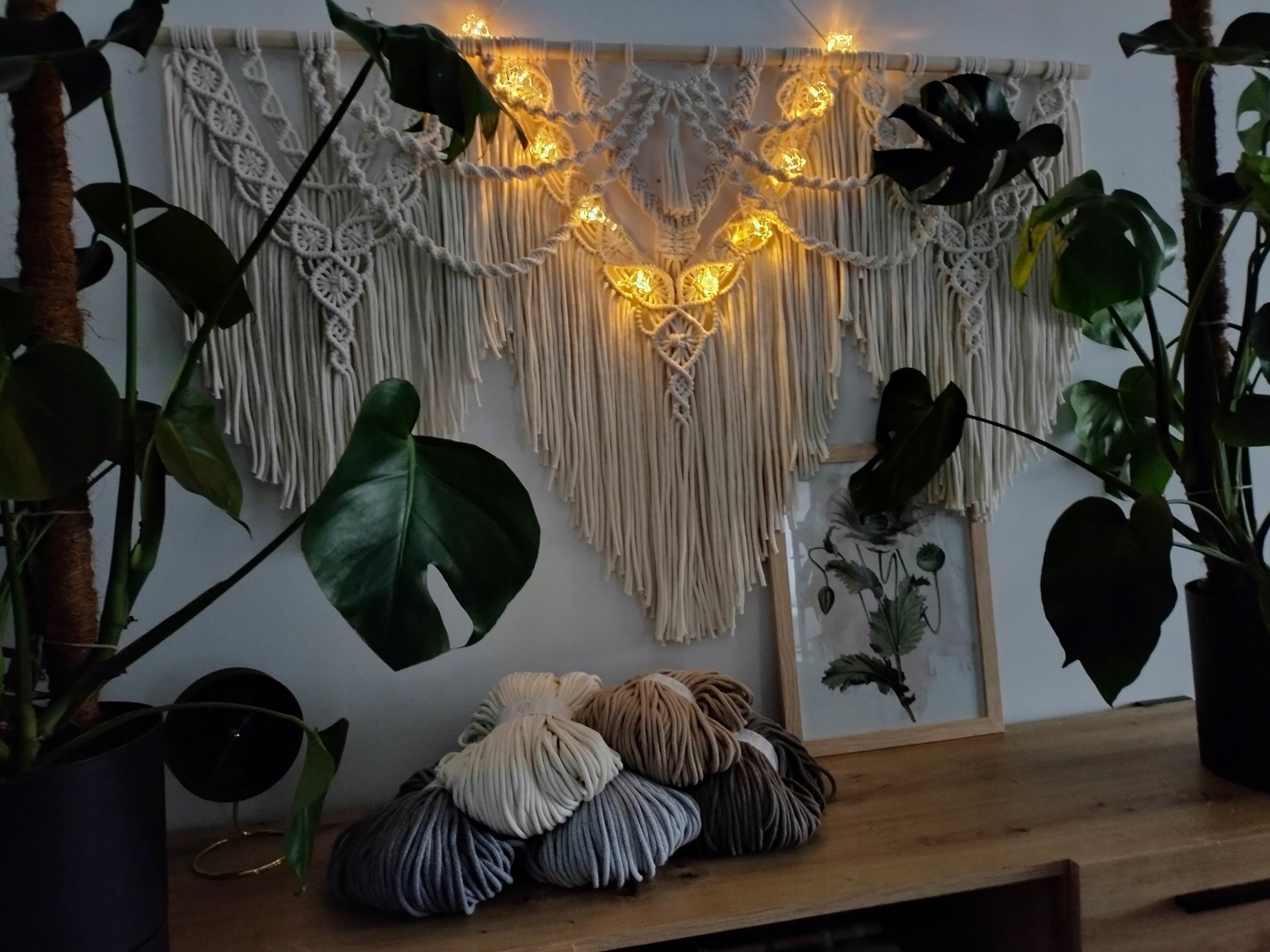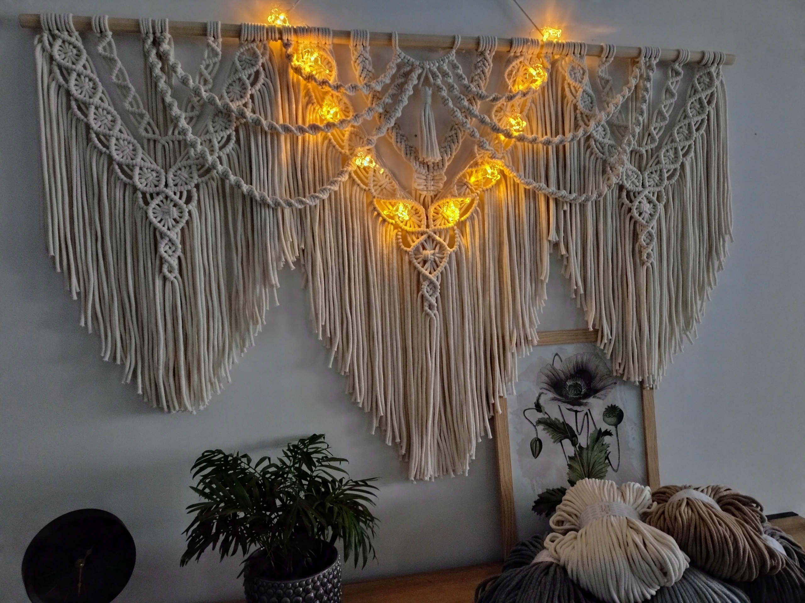 I також виконуємо більші індивідуальні проекти, макраме для фонів фото, весільне макраме.