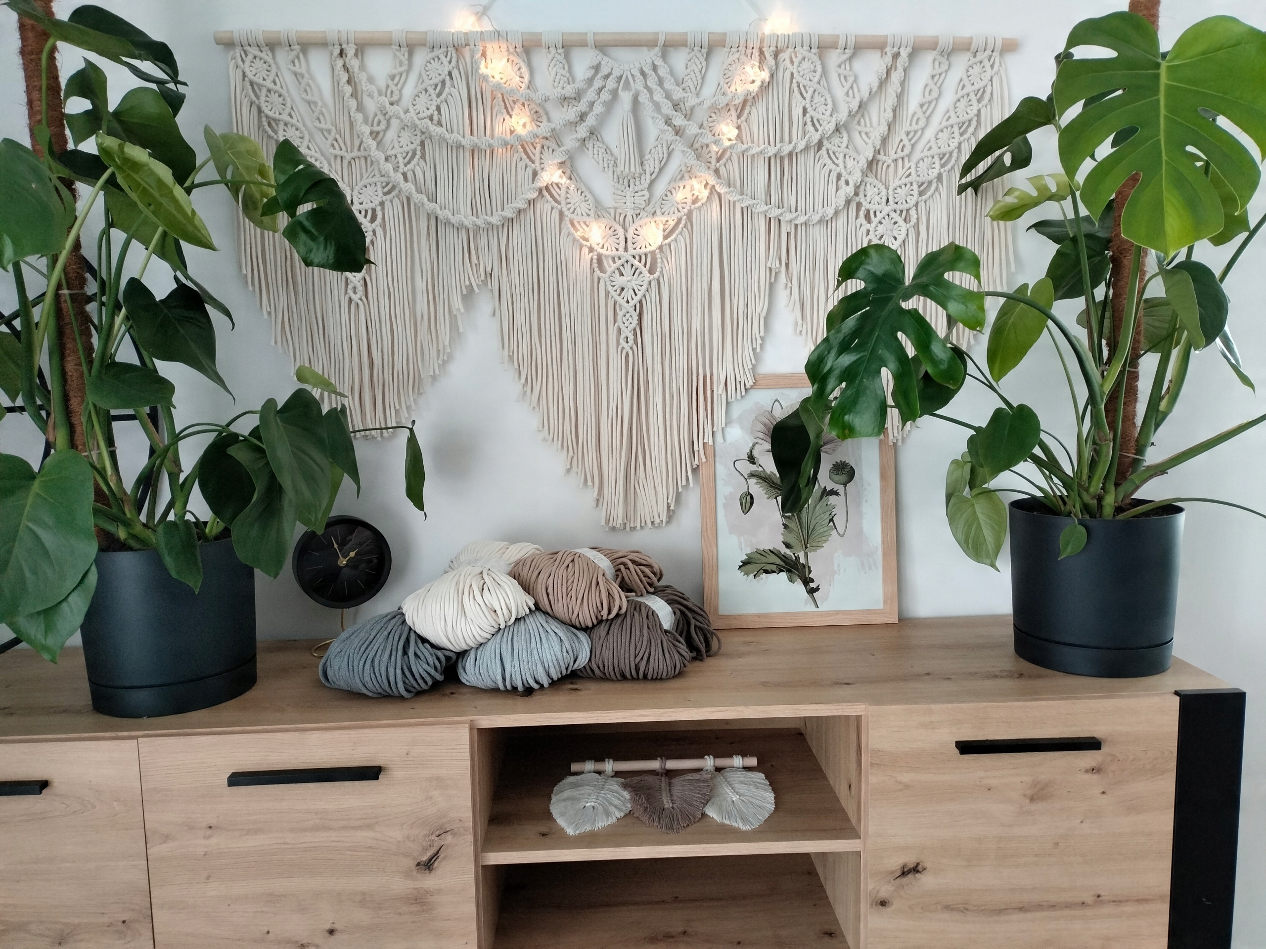 Красиве, густе плетіння, шнурок преміум-класу та модний колір роблять макраме Monstera XLідеальним стильним акцентом у вашій квартирі.